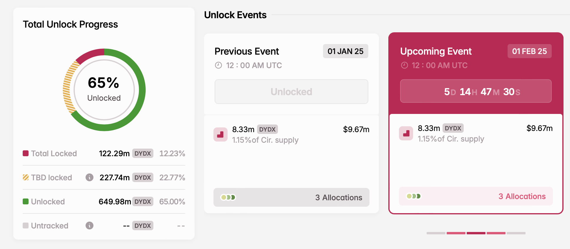 - Кількість розблокованих токенів: 8,33 млн DYDX