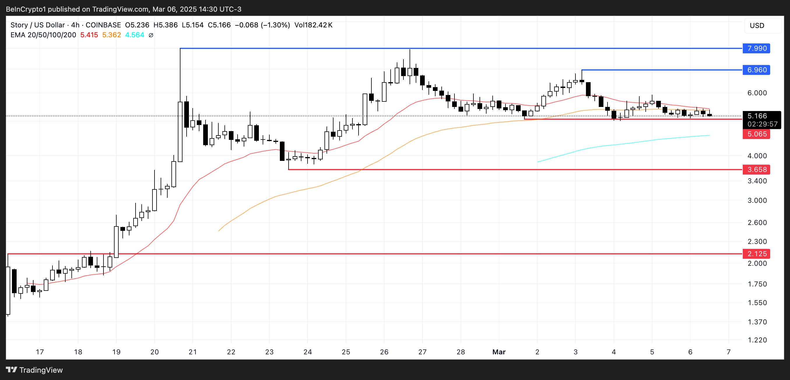 Якщо токени ШІ відновлять моментум, як це було кілька місяців тому, Story може отримати вигоду і протестувати опір на рівні 6,96 і 7,99 доларів, потенційно перевищивши 8 доларів вперше і досягнувши нових історичних максимумів.