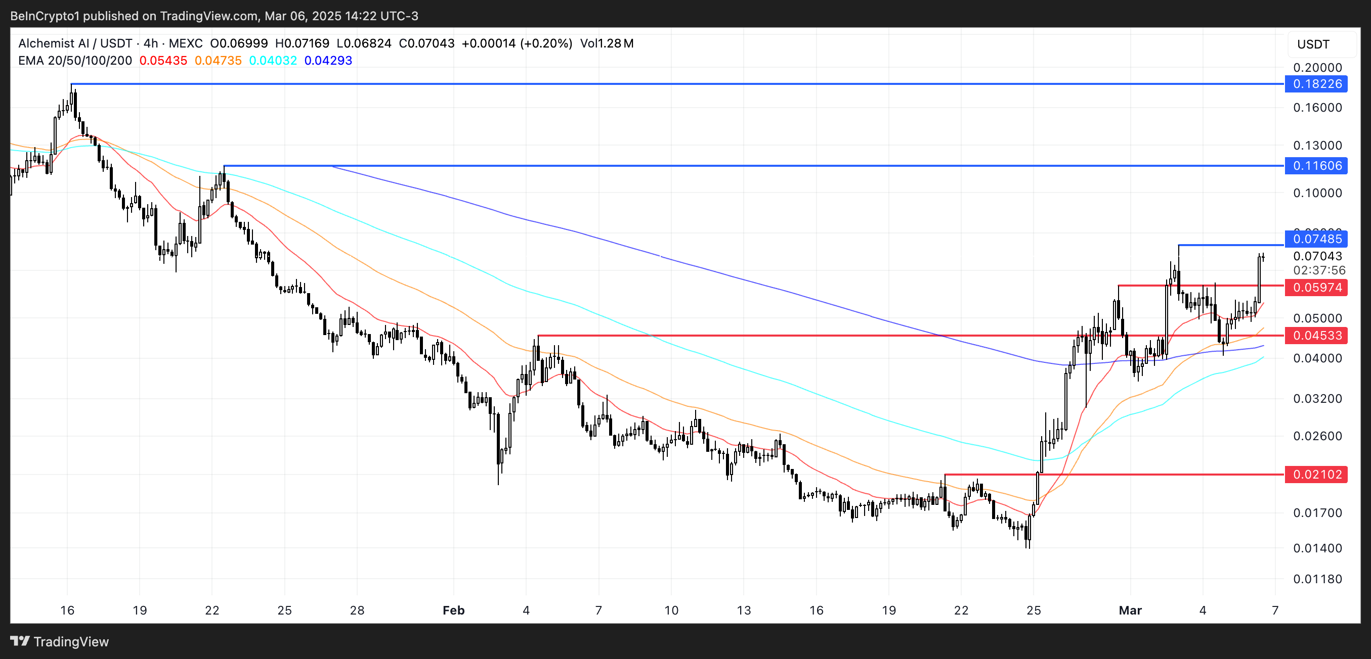 ALCH зріс більш ніж на 34% за останні 24 години та понад 54% за останні сім днів, довівши свою ринкову капіталізацію до 60 мільйонів доларів — найвищого рівня з кінця січня. Якщо висхідний тренд триватиме, ALCH може протестувати опір на рівні 0,0748 доларів, а прорив потенційно підштовхне його до 0,116 доларів або навіть 0,18 доларів, що є найвищим рівнем із середини січня.