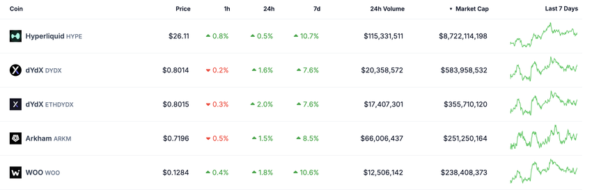 Криптоактиви, пов’язані з безстроковими контрактами, демонструють ознаки відновлення, оскільки всі п’ять найбільших токенів цього сектору зросли за останній тиждень. Лідером став HYPE, який додав понад 10%. Його зростання свідчить про підвищений інтерес до цієї категорії після тривалого періоду стагнації.