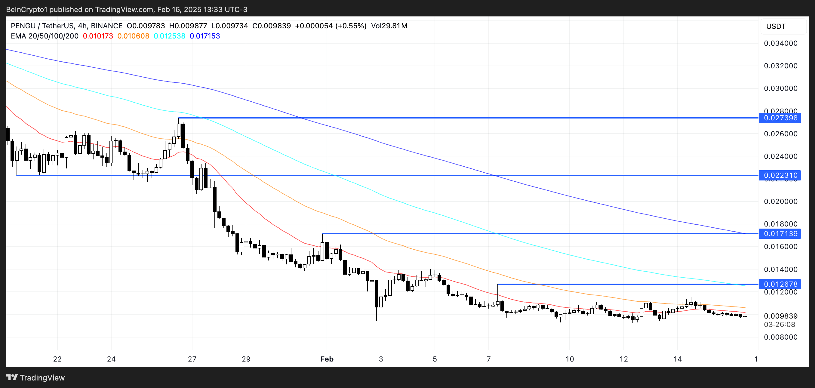 Прорив може спочатку протестувати рівні опору на 0,0126 доларів і 0,017 доларів, що буде ключовим для розвороту його низхідного тренду. Стійкий бичачий моментум може потім підштовхнути PENGU до 0,022 доларів і навіть 0,027 доларів.