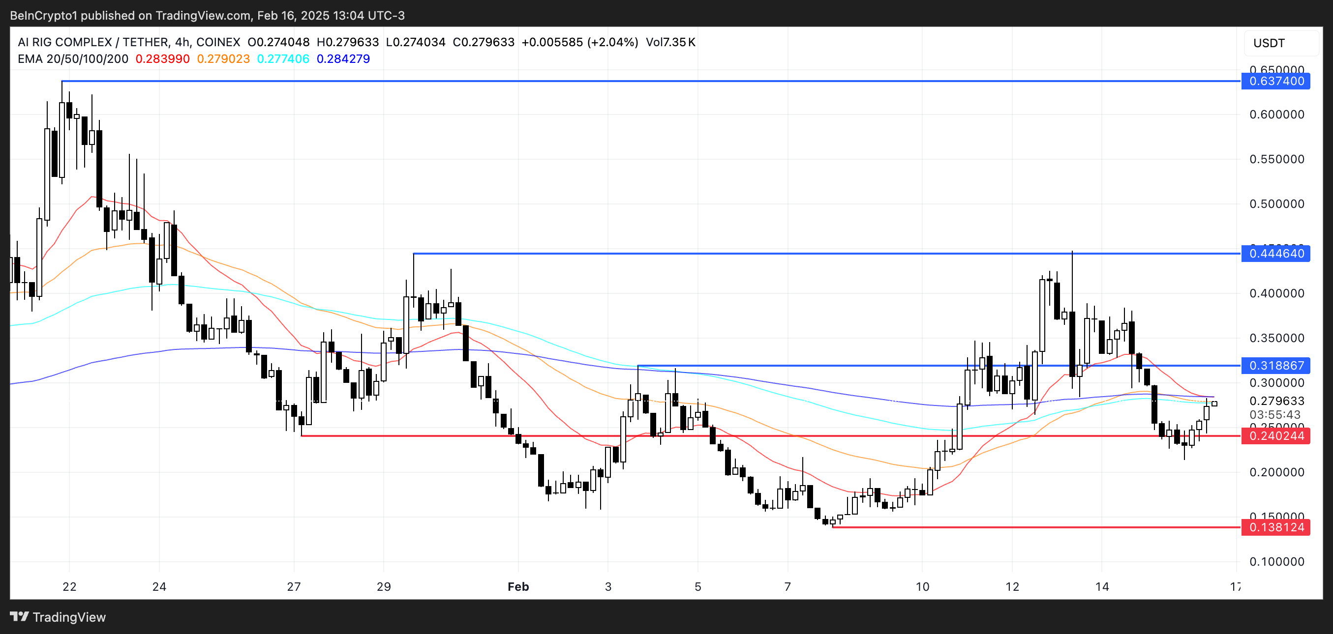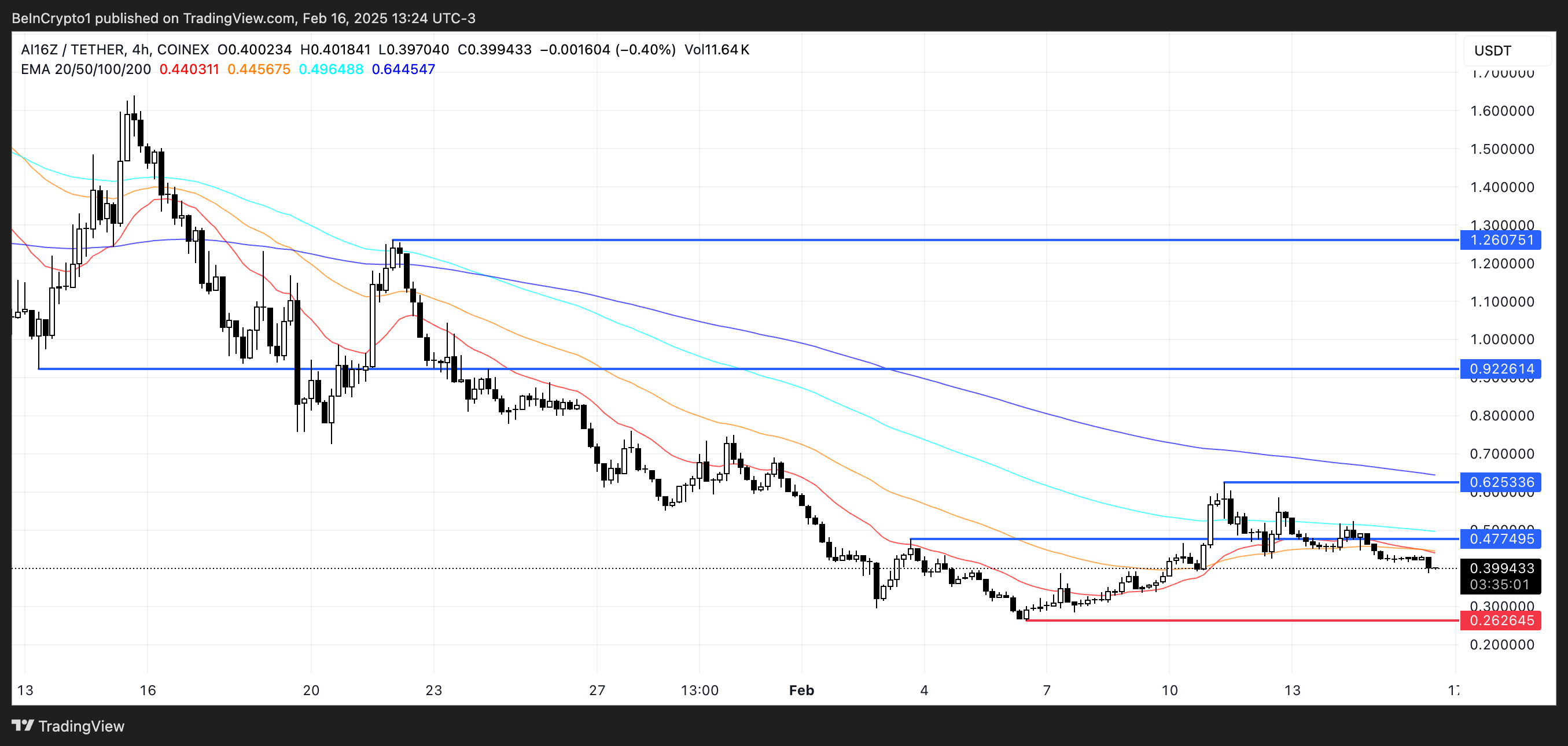 Його ринкова капіталізація наразі становить 438 мільйонів доларів, але його лінії EMA свідчать про те, що тренд все ще ведмежий. Якщо низхідний тренд збережеться, AI16Z може протестувати підтримку на рівні 0,26 долара, що створить додатковий тиск на його ціну. Невдача утримати цей рівень може сигналізувати про подальше зниження для токена.