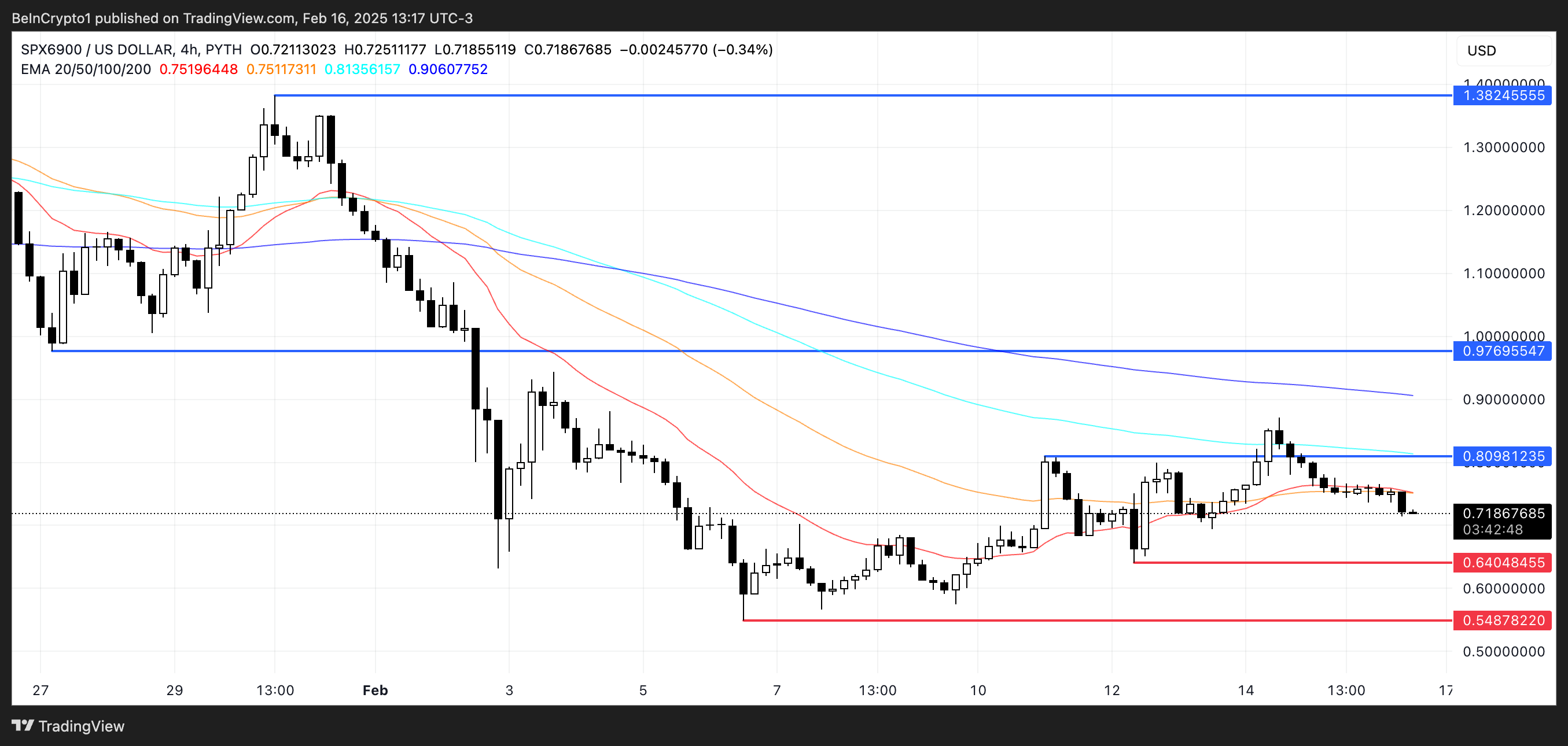 SPX6900 перебуває у різкій корекції, впавши на 48% за останні 30 днів, подібно до багатьох інших мемкоінів. Його ціна залишається нижче 1 долара протягом двох тижнів, а його лінії EMA показують ведмежий прогноз, з короткостроковими лініями нижче довгострокових.