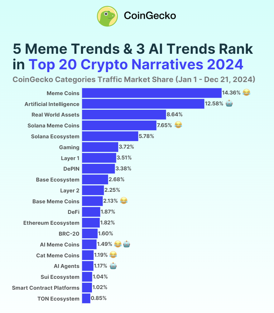 Цей моментум поставив мем-монети Solana на 4-е місце за інтересом інвесторів, що становить 7,65% обговорень криптонаративів, за даними CoinGecko.