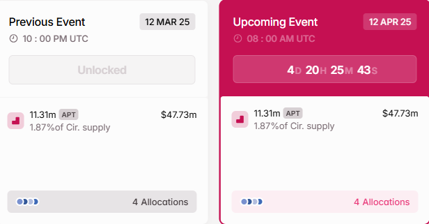 12.04.2025 мережа Aptos розблокує 11,31 мільйона токенів APT вартістю приблизно 47,73 мільйона доларів, що становить 1,87% циркулюючої пропозиції. Токени будуть розподілені серед спільноти, основних учасників, фонду та інвесторів.