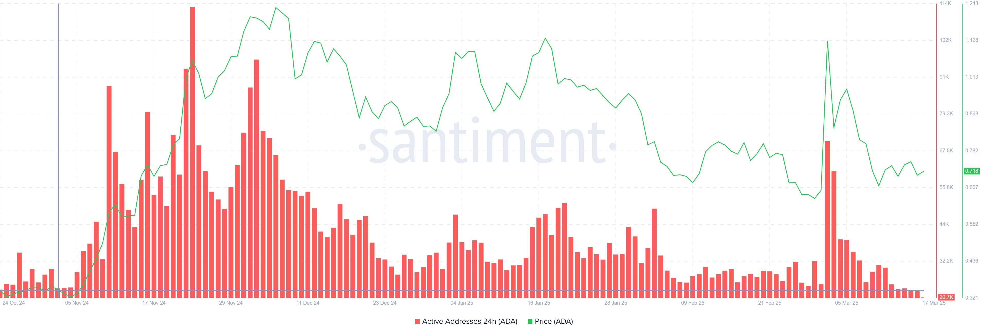 Загалом, імпульс ринку Cardano відображає відчуття невизначеності. Кількість активних адрес у мережі нещодавно знизилася до чотиримісячного мінімуму в 20 700. Це зниження участі інвесторів свідчить про відсутність ентузіазму серед утримувачів ADA. Багато інвесторів, здається, відступають, очікуючи на чіткіші сигнали відновлення, перш ніж знову взаємодіяти з токеном.