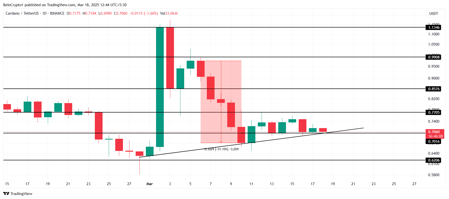 Cardano наразі торгується за $0,70, утримуючись вище рівня підтримки $0,70, а висхідна лінія підтримує ціну з початку березня. Негайною метою для ADA є прорив рівня опору $0,77, але це залишається викликом. Досягнення цього вимагатиме зростання приблизно на 9%, що може бути складним за поточних ринкових умов.