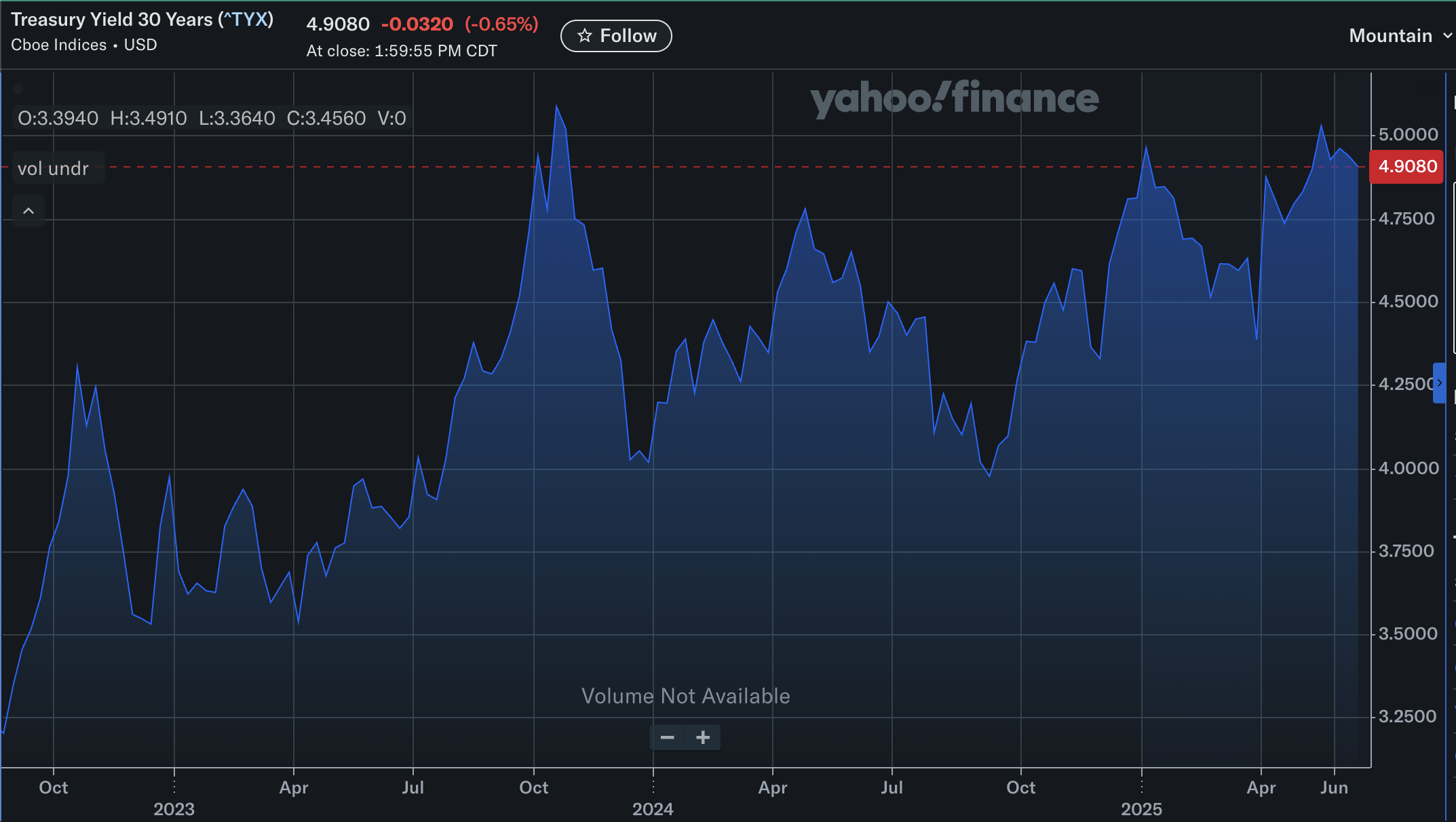 Менше ніж три тижні тому, зростання дохідності облігацій налякало інвесторів, коли дохідність 30-річних облігацій перевищила позначку 5 % вперше з жовтня 2023 року.