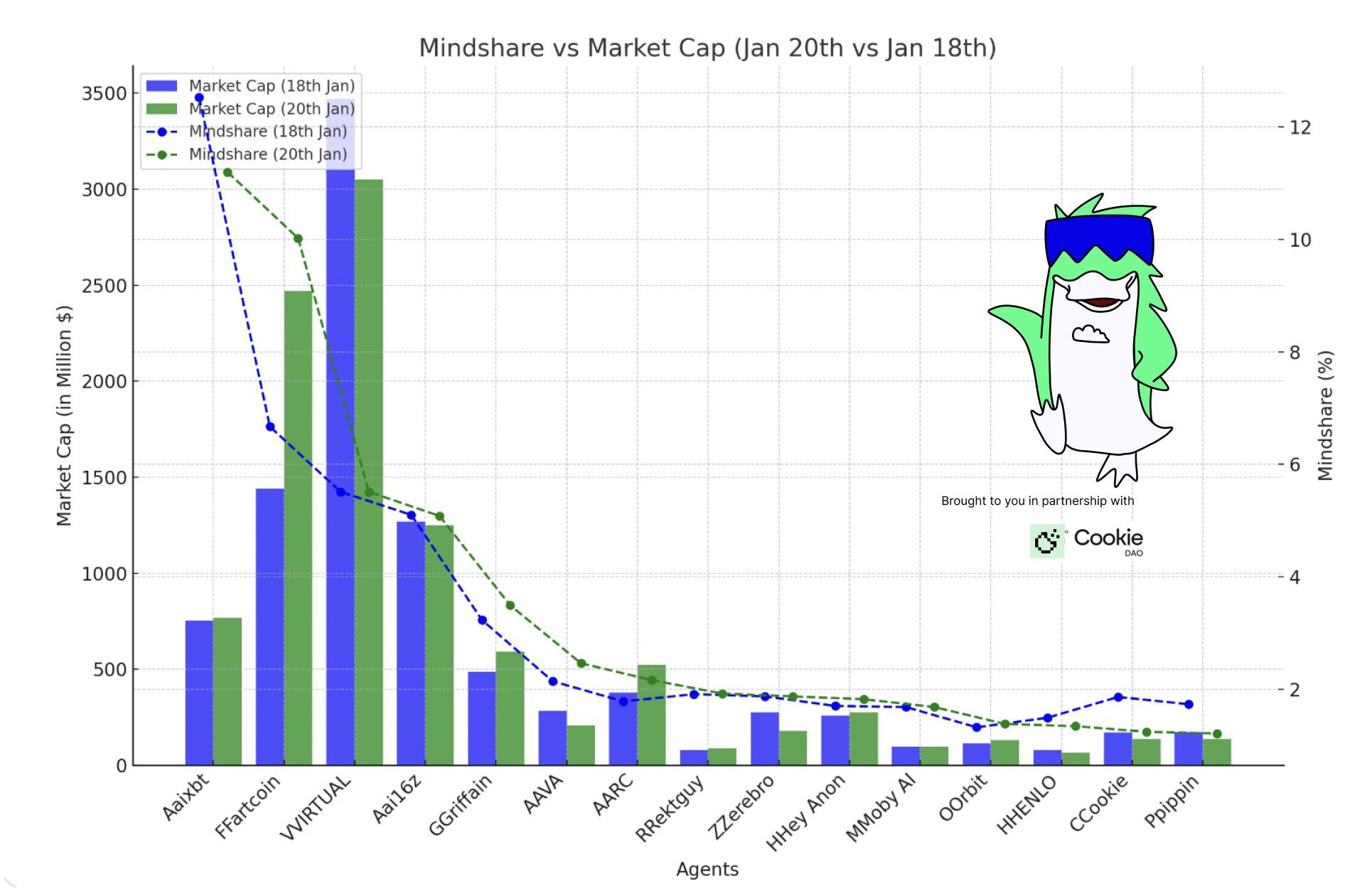 За даними CoinGecko, капіталізація ринку токенів AI агентів знизилася після того, як токени сім’ї Трамп були лістинговані на вихідних. На момент написання статті вона знизилася на понад 11% до 12,6 мільярдів доларів.