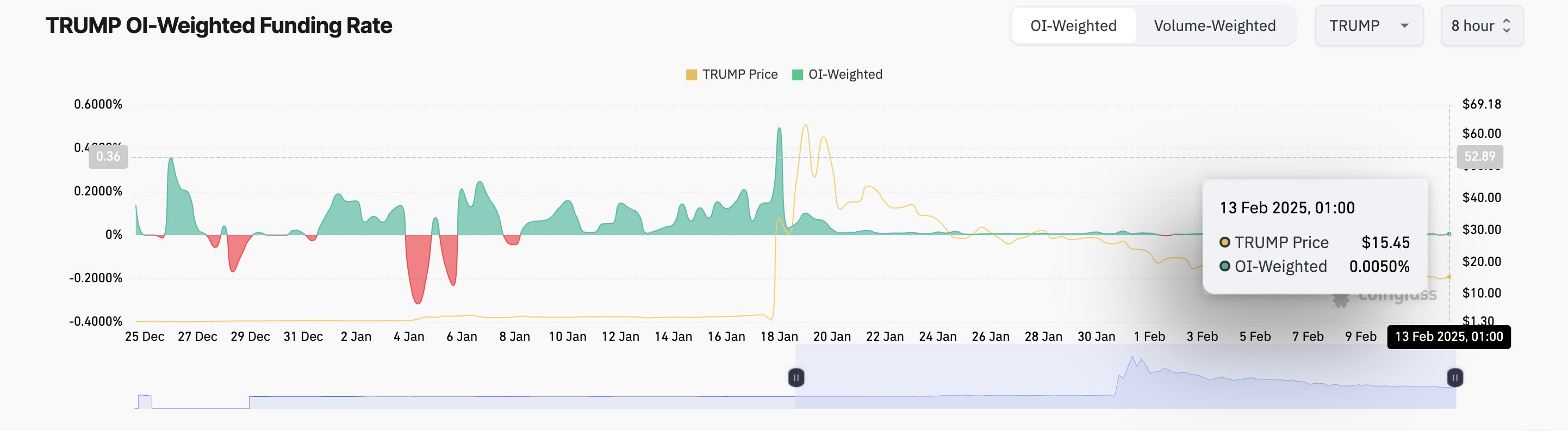 Крім того, ставка фінансування TRUMP залишалася позитивною, незважаючи на недавні ринкові труднощі. На момент публікації вона становить 0,0050%.