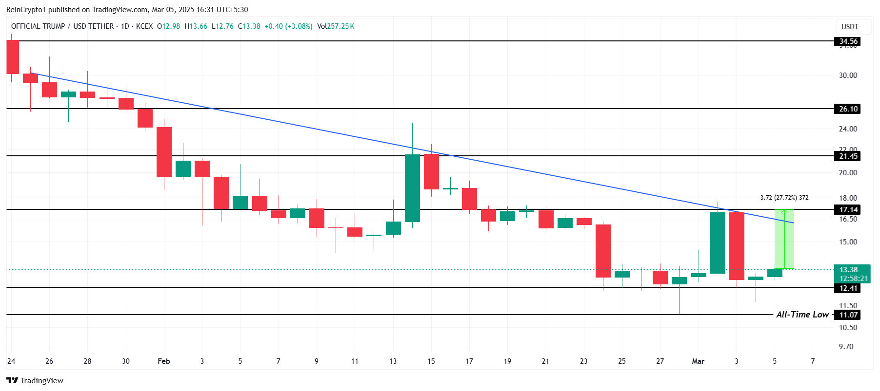 Наразі TRUMP торгується на рівні 13,38 доларів, утримуючи підтримку на критичному рівні 12,41 доларів. Альткоїн продовжує перебувати у низхідному тренді, не маючи змоги подолати ключовий рівень опору 17,14 доларів. Однак позитивні очікування, пов’язані з Криптосамітом у Білому домі, можуть стати каталізатором для зростання.