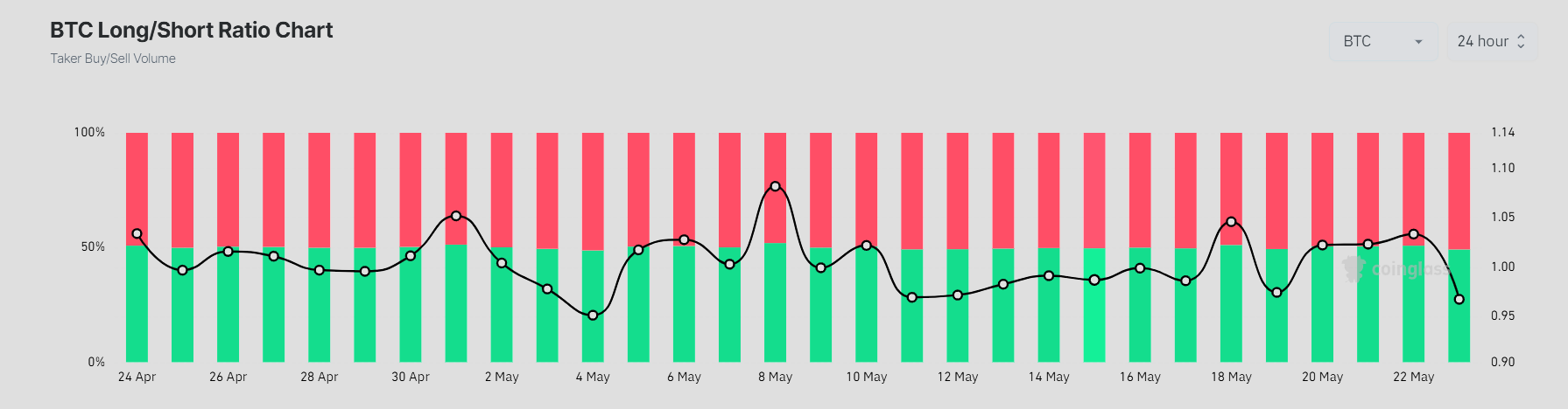 Тим часом, співвідношення довгих і коротких позицій біткоїна залишається майже рівним, що свідчить про короткострокову невизначеність у напрямку ринку. Вчора довгі позиції біткоїна домінували на графіках на рівні 54 %.