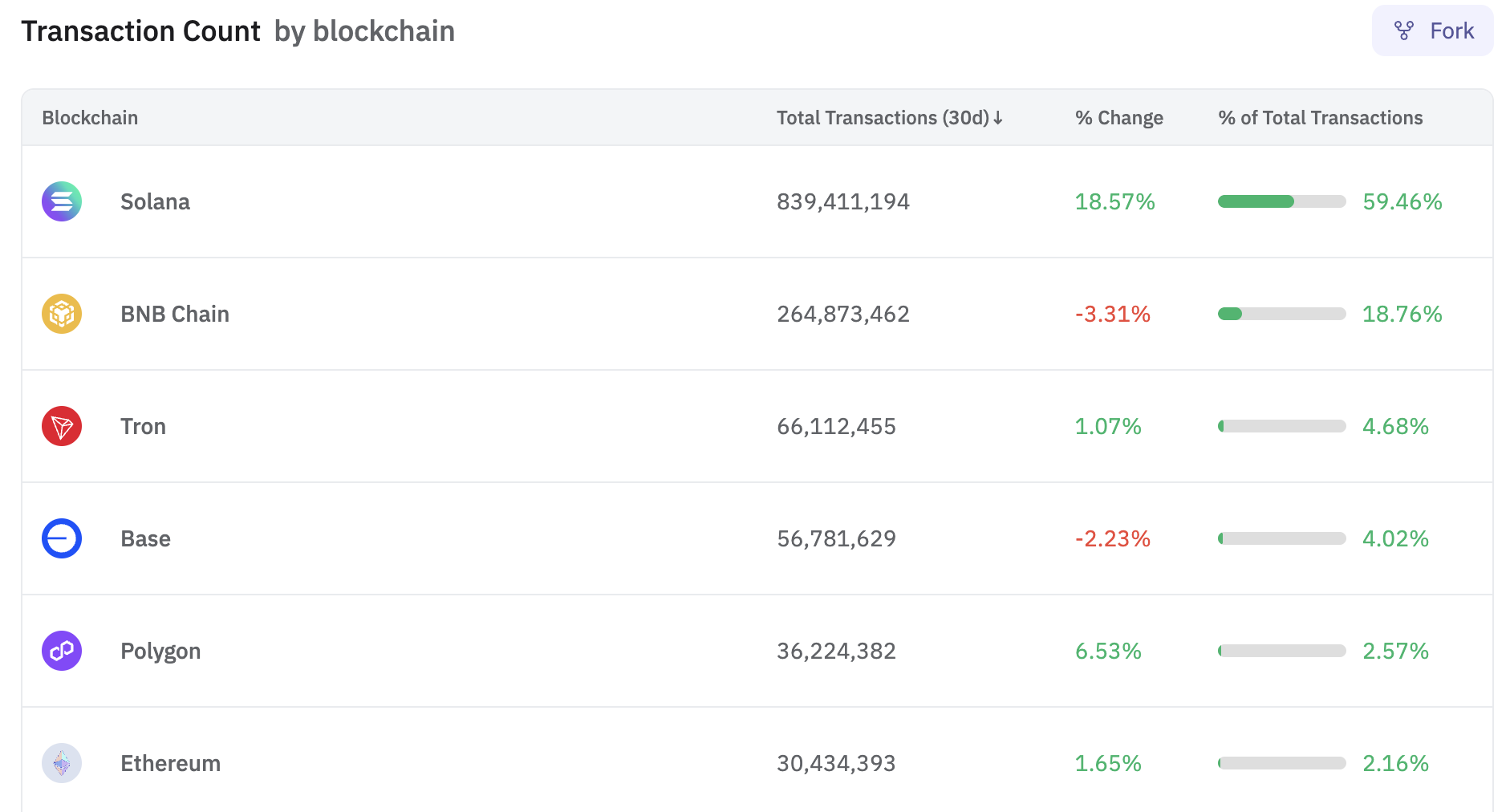 Solana (SOL), зокрема, лідирує за кількістю транзакцій (59,46%). Це частково можна пояснити вибуховим зростанням мемкоїнів, запущених через різні проєкти на платформі.