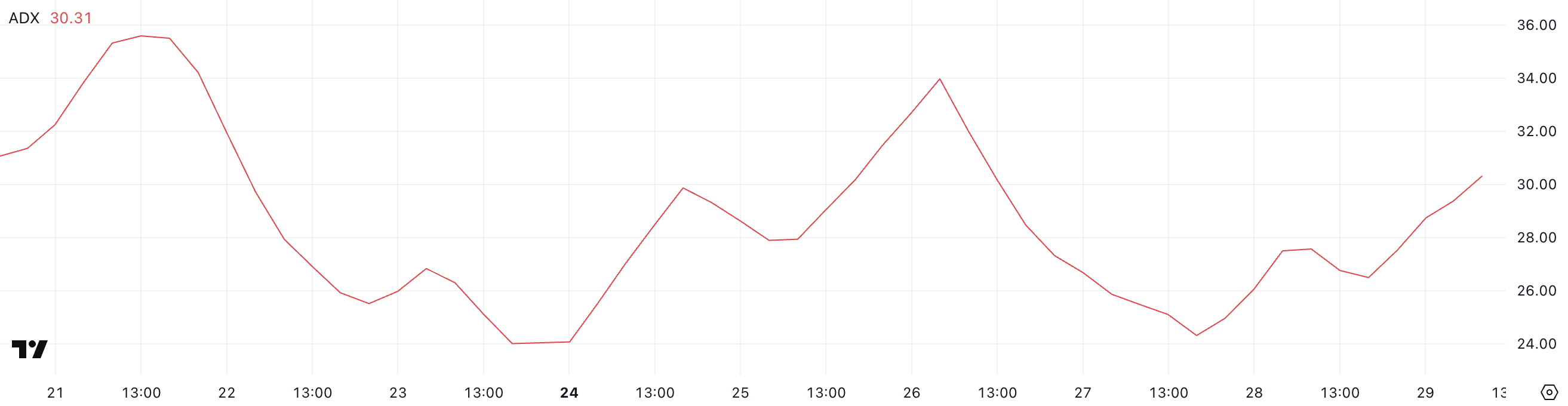 Значення нижче 20 свідчать про слабкий або неіснуючий тренд, тоді як значення вище 25 вказують на те, що тренд набирає обертів.