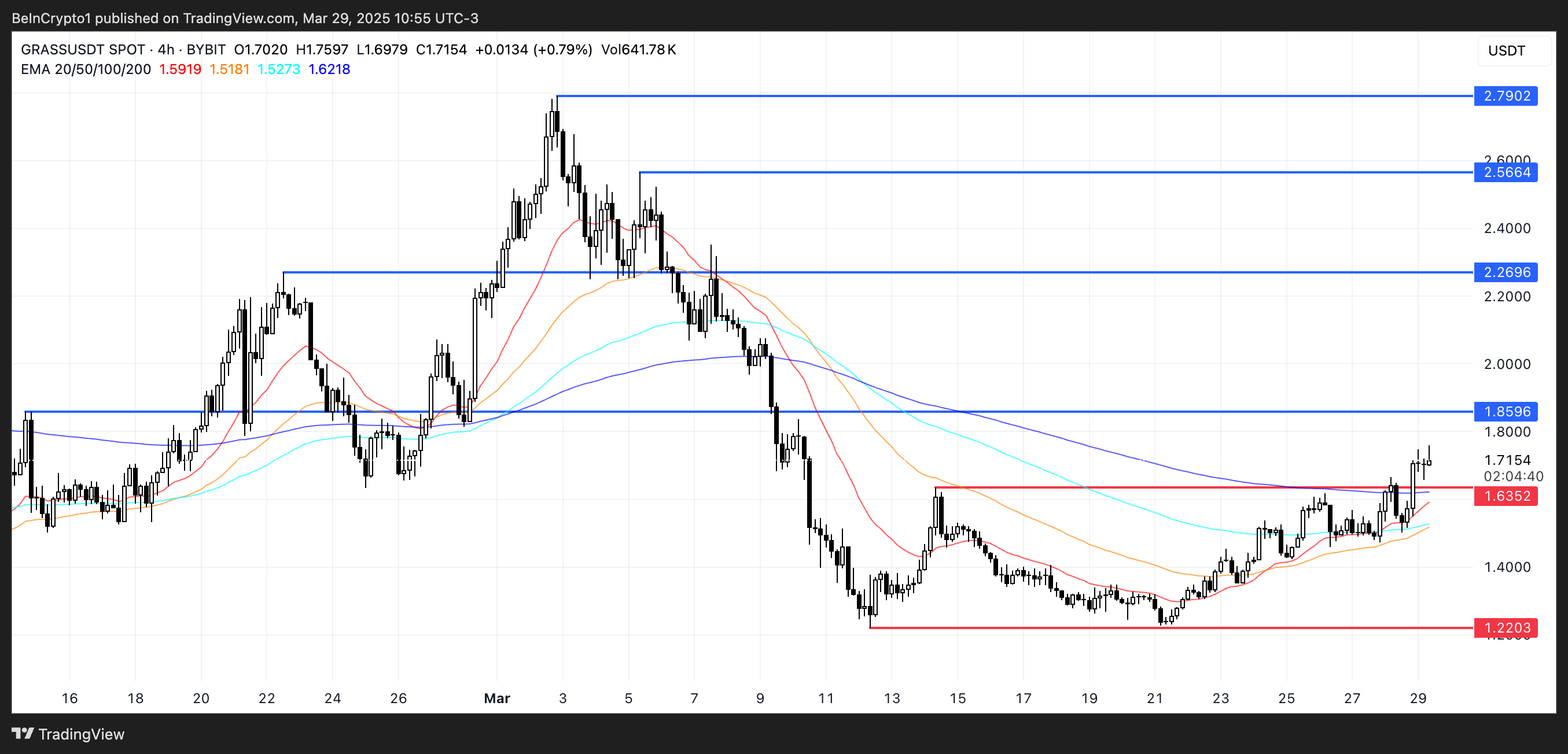 Лінії експоненційного ковзного середнього (EMA) GRASS демонструють ознаки потенційного золотого перетину — бичачого сигналу, який виникає, коли короткострокова EMA перетинає довгострокову знизу вгору.