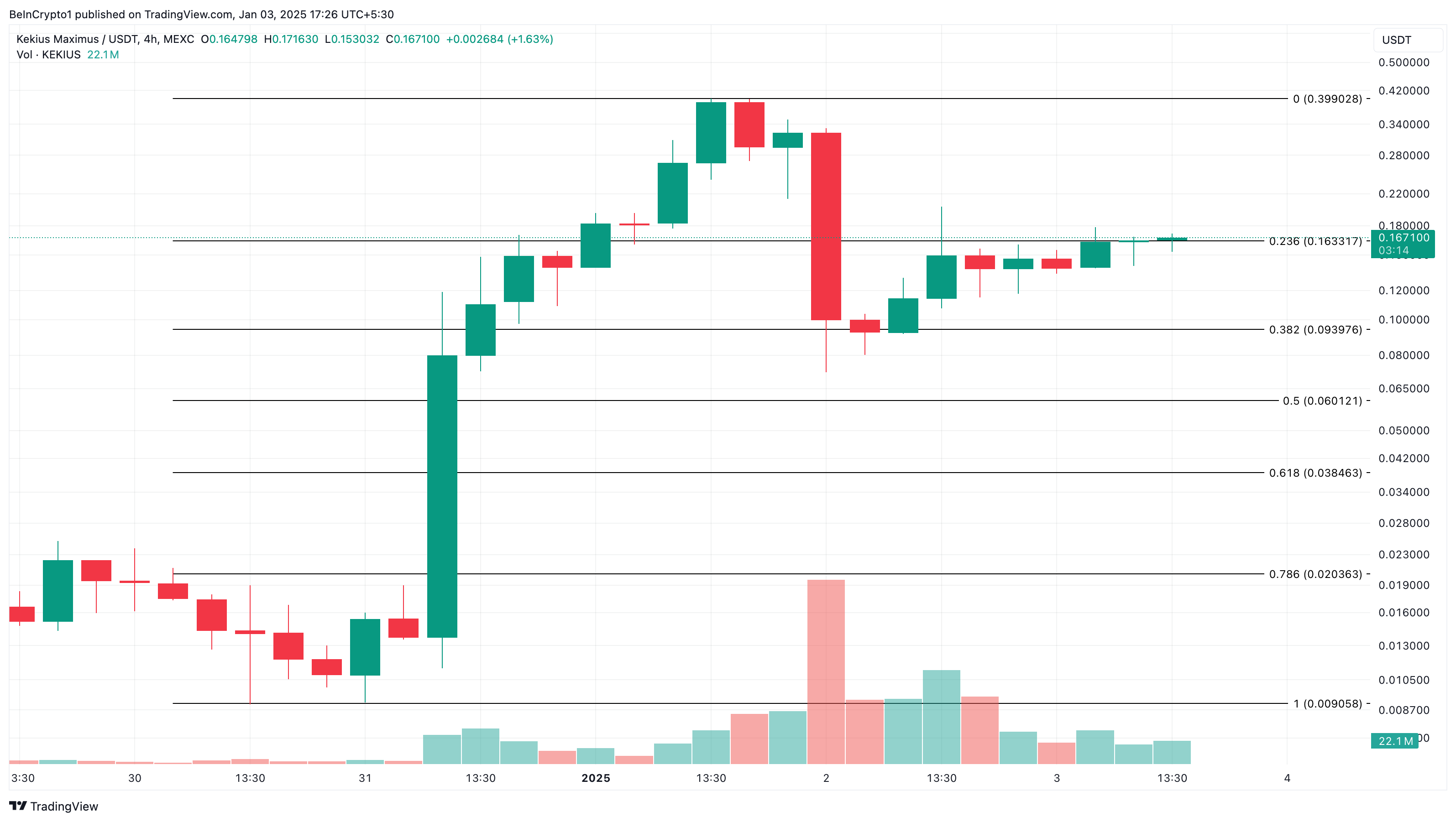 Цікаво, що це коригування зупинилося, оскільки вартість токена відновилася до 0,17 USD. За даними 4-годинного графіка, KEKIUS готовий до зростання. Якщо це збережеться, то вартість альткоїна може підскочити до 0,40 USD.