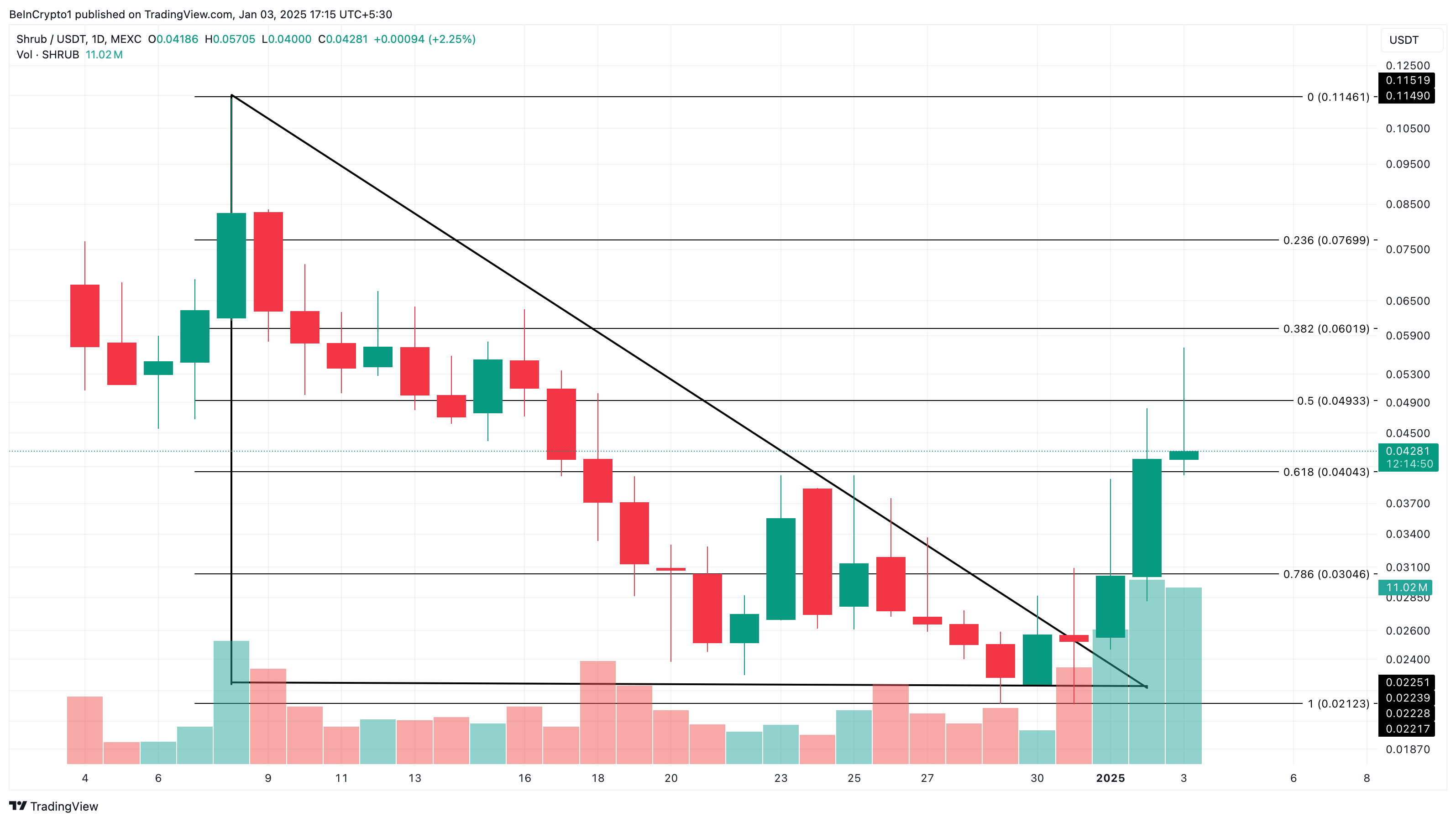 В результаті, ціна SHRUB зросла на 13,87% за останні 24 години. На денному графіку альткоїн досяг цього рубежу після виходу з низхідного трикутника, який тривав з 8 по 31 грудня.