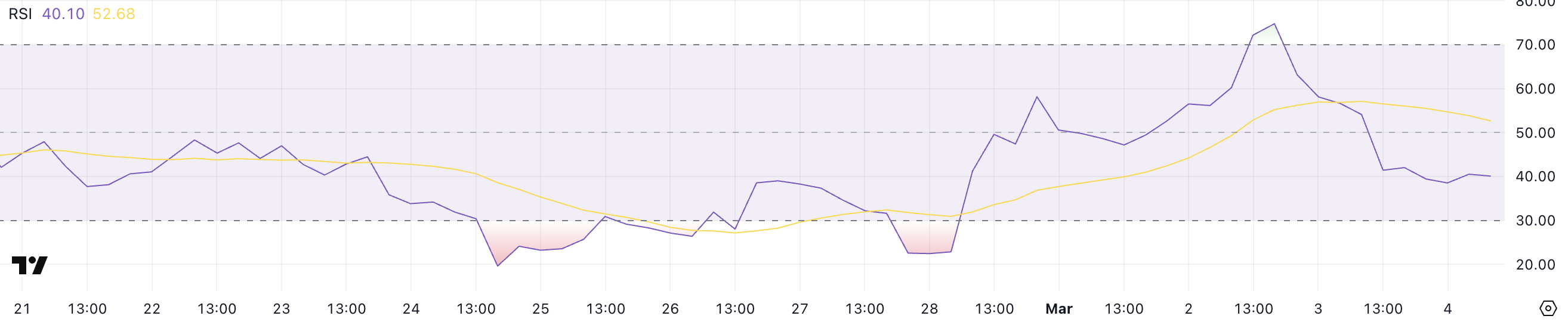 Індекс відносної сили (RSI) для TRUMP знизився до 40,1, що є різким падінням з 74,7 лише два дні тому, відображаючи значну зміну моментуму, коли Дональд Трамп підтвердив тарифи на продукцію з Мексики, Канади та Китаю.