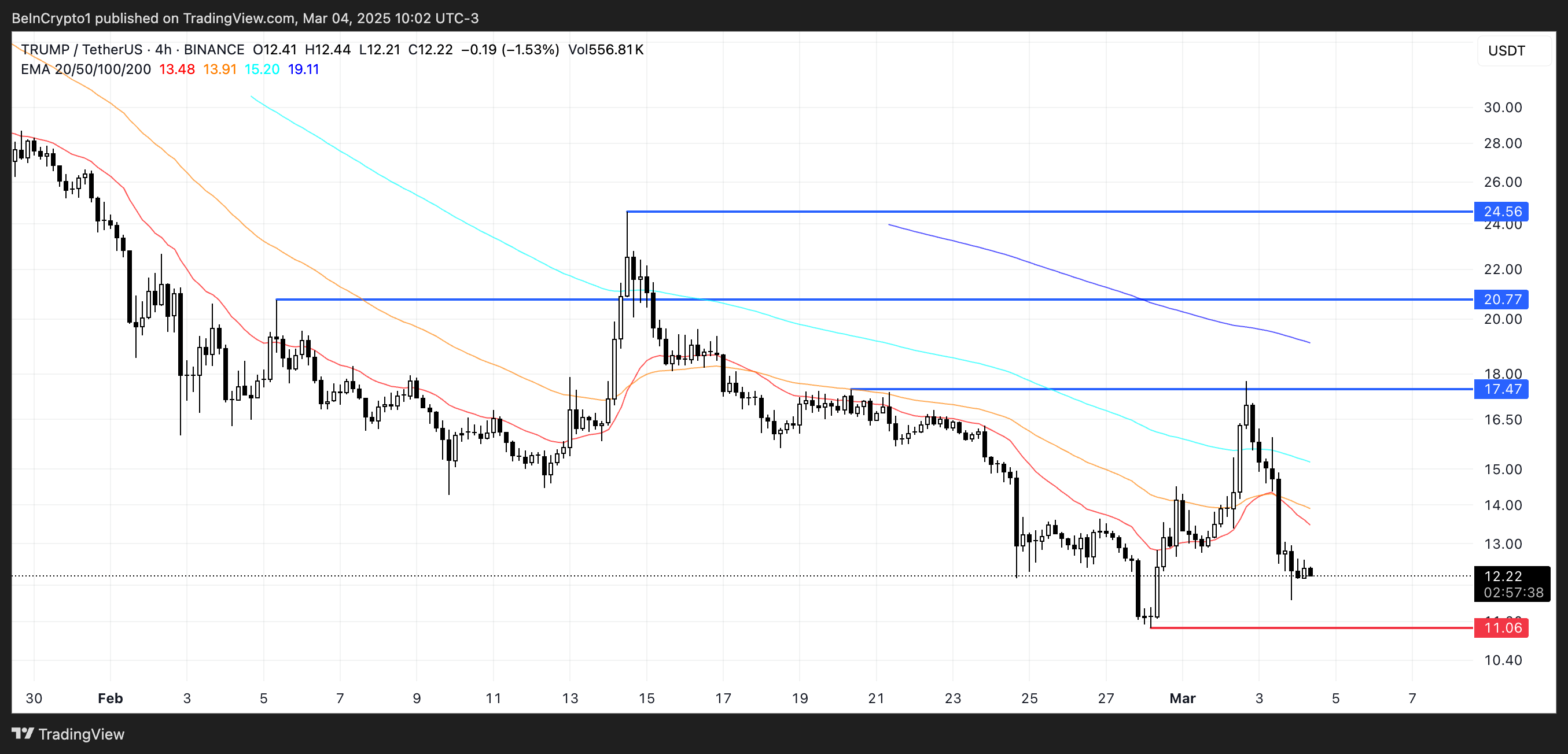 З ключовою підтримкою на рівні 11 доларів, TRUMP ризикує торгуватися нижче цього рівня вперше з моменту свого запуску, якщо тиск продажів продовжиться. Однак, майбутній Саміт з криптовалют у Білому домі 07.03.2025 може стати потенційним каталізатором для відновлення, з проривом вище 17,47 доларів, що може відправити TRUMP до 20,7 або навіть 24,5 доларів.