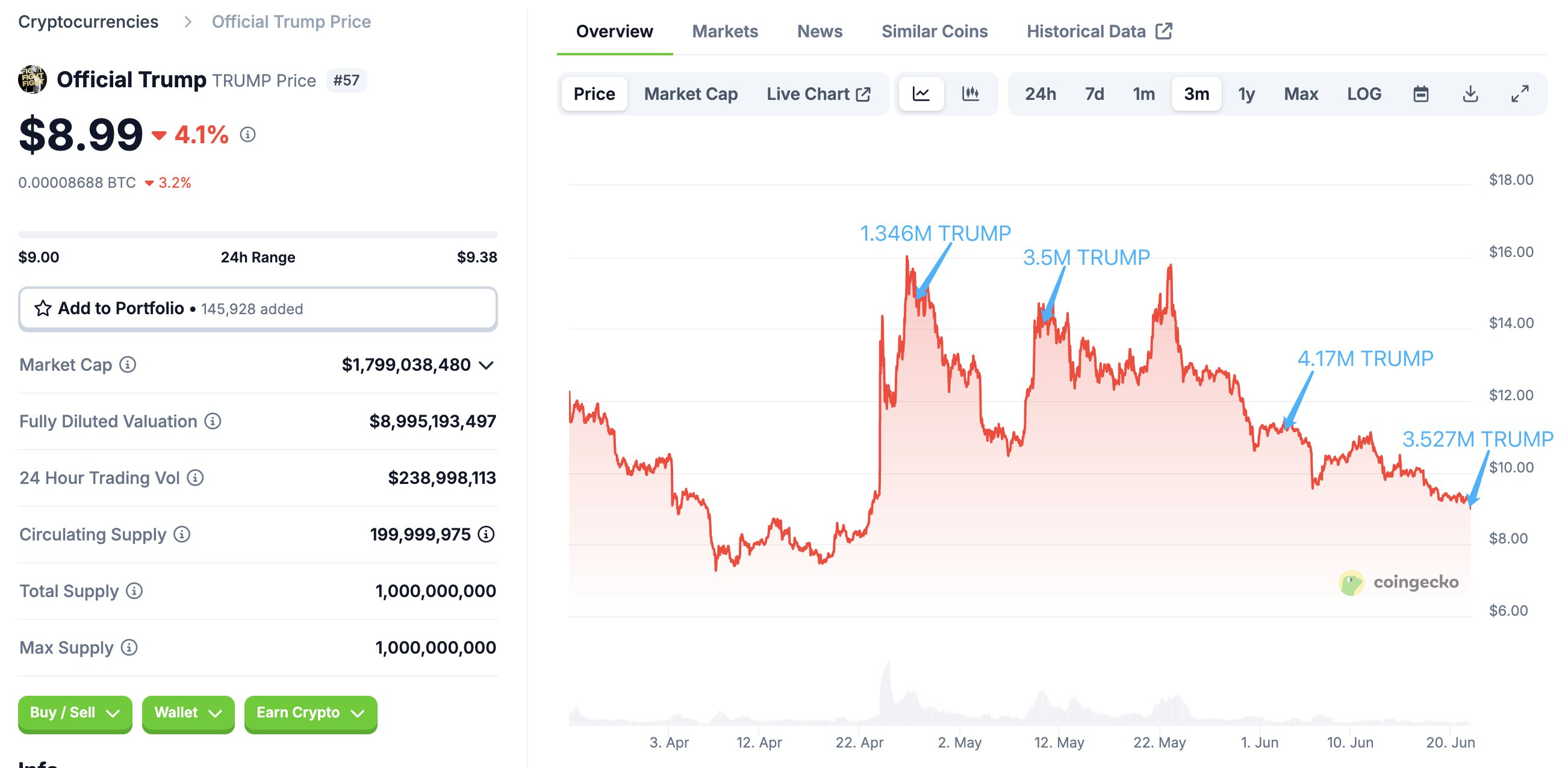 За даними BeInCrypto, TRUMP втратив близько 6 % за останню добу і наразі коливається біля 8,68 доларів на момент публікації. З моменту свого дебюту в січні вартість токена знизилася приблизно на 90 % від свого піку понад 75 доларів.