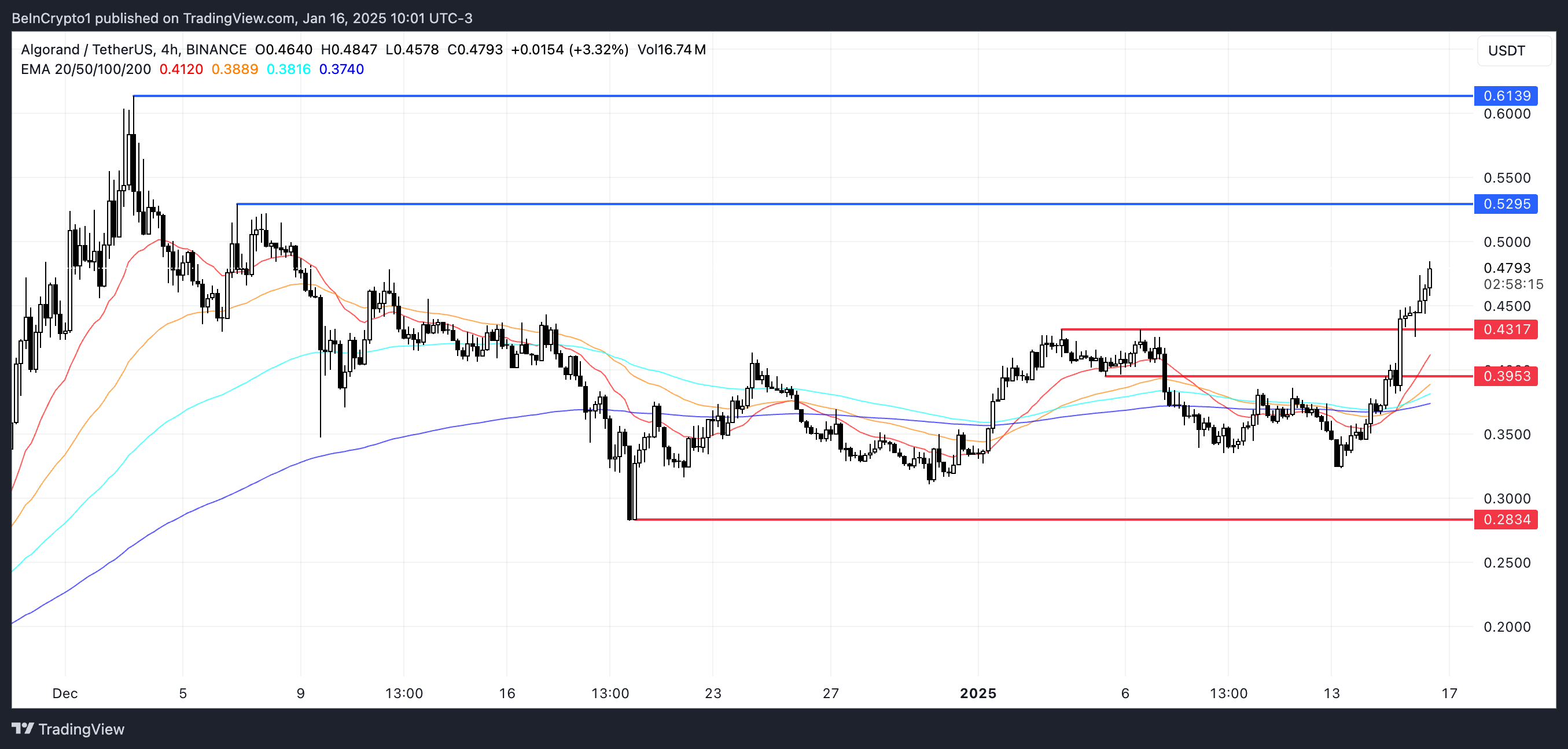 EMA лінії Algorand показують, що вчора сформувався золотий перетин, сигналізуючи про потенціал для стійкого бичачого моментуму. Якщо поточний висхідний тренд продовжиться, ціна ALGO може протестувати опір на рівні 0,529 доларів, а прорив цього рівня може підштовхнути її до 0,613 доларів, що представляє потенційний приріст на 28,2% від поточних рівнів.