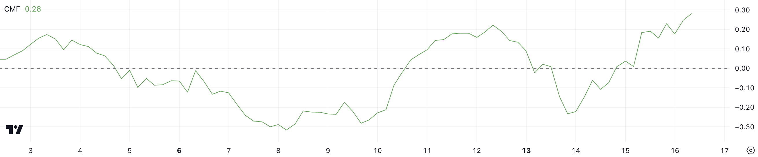 ALGO Chaikin Money Flow (CMF) наразі становить 0,28, значно зрісши з -0,23 два дні тому. Це найвищий рівень CMF для ALGO з 29 листопада, що відображає сильний зсув ринкових настроїв у бік накопичення та тиску покупців.