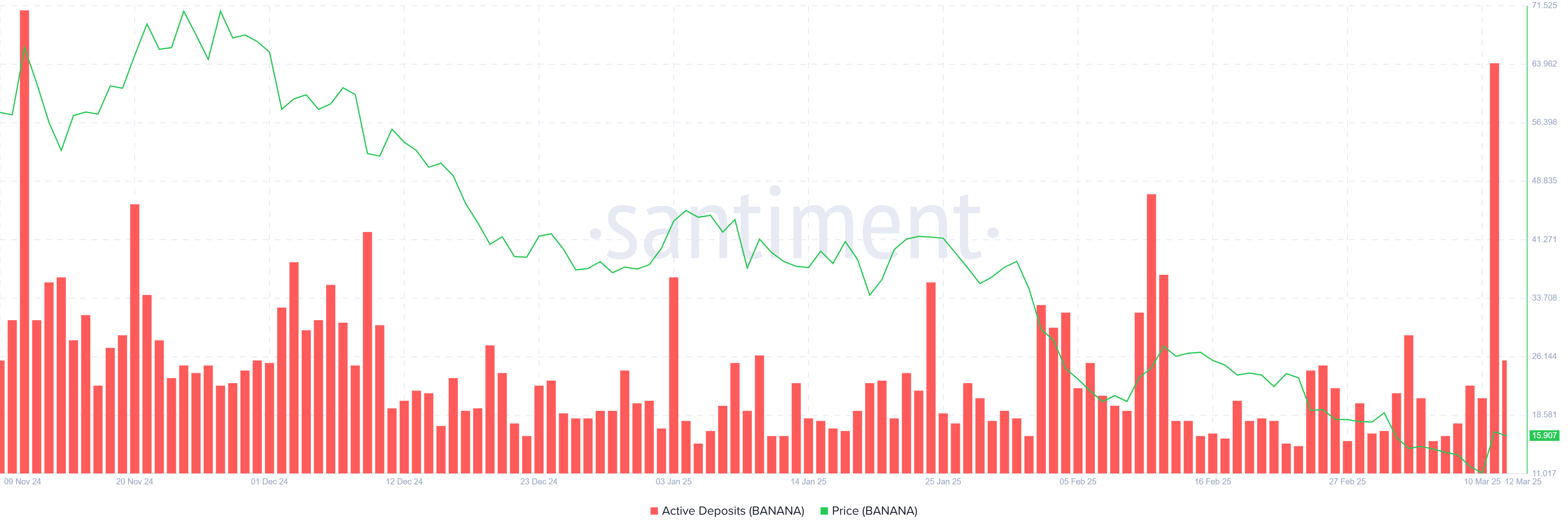 Загальний макромоментум для Banana був відзначений значним сплеском активних депозитів за останні 24 години, найвищим з листопада 2024 року. Цей сплеск вказує на те, що більше токенів Banana вивантажуються, відображаючи настрої інвесторів та поведінку фіксації прибутків.