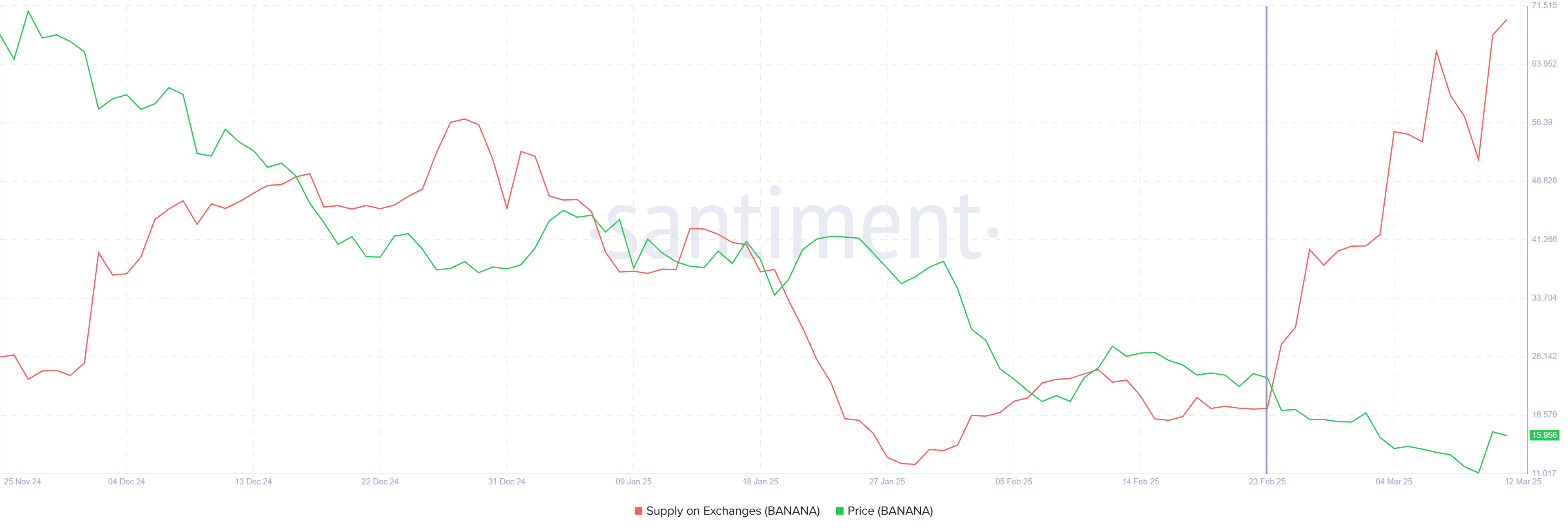 За останні два тижні пропозиція Banana на біржах зросла на 300 000 токенів, вартістю трохи менше 5 мільйонів доларів. Це збільшення тиску на продаж становить приблизно 9% від загальної ринкової капіталізації, яка становить 55 мільйонів доларів. Зростання пропозиції на біржах є прямим наслідком неспроможності альткоїна підтримати своє відновлення, що спонукає багатьох інвесторів продавати та фіксувати прибутки.