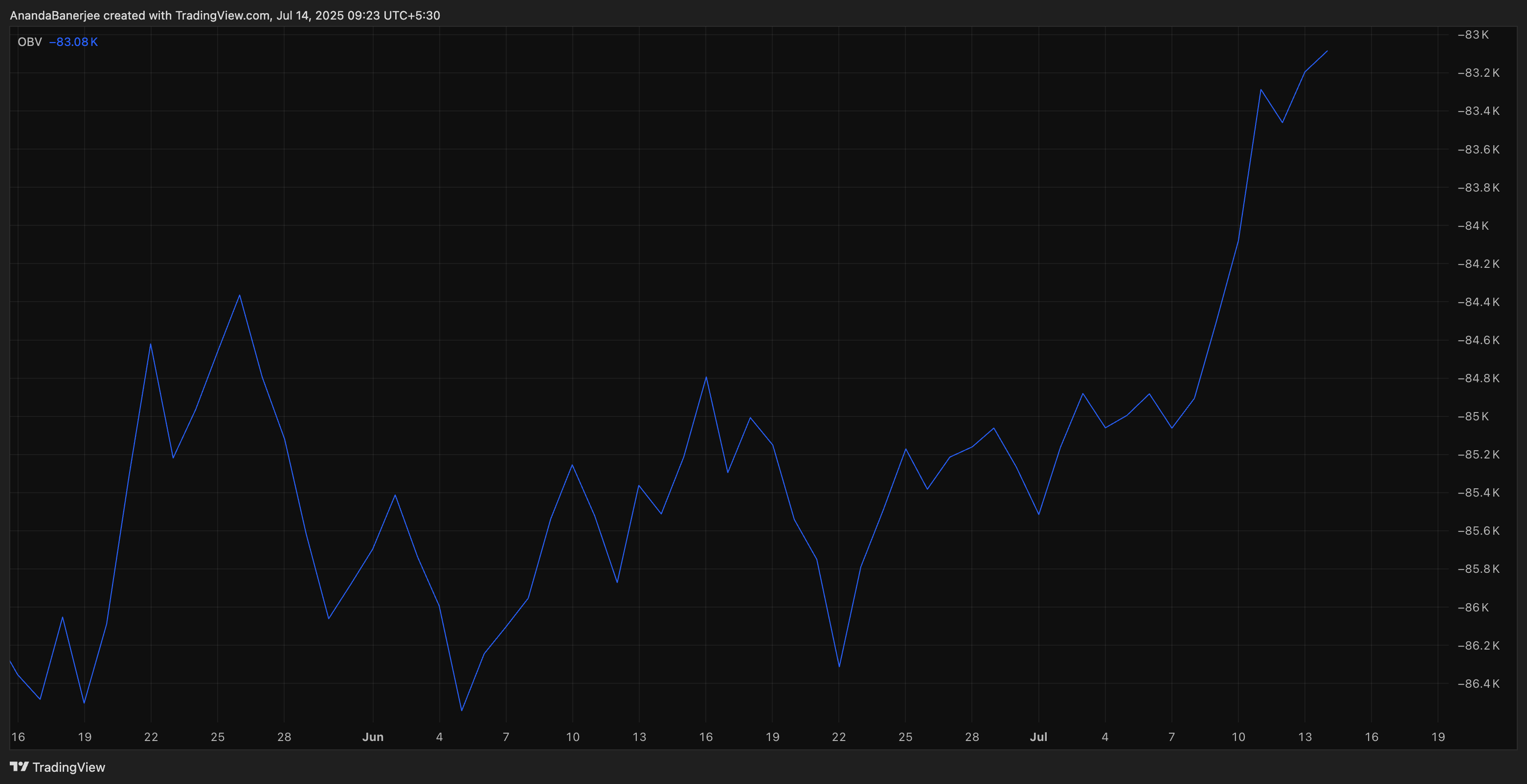 OBV вимірює кумулятивний тиск купівлі/продажу на основі напрямку щоденного обсягу. Це бичачий знак, коли він слідує за позитивним ціновим трендом.