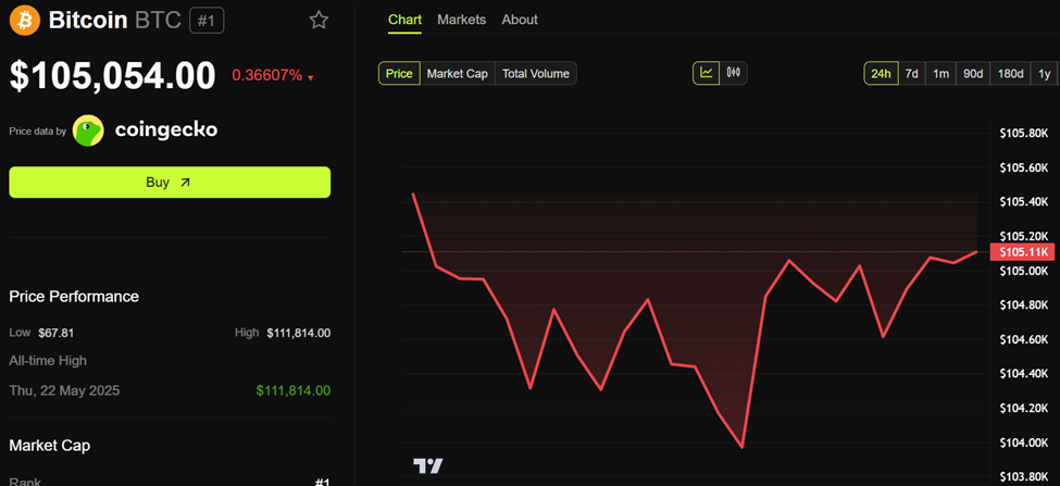 За даними BeInCrypto, біткоїн торгувався за 105 054 доларів на момент написання, знизившись на 0,36 % за останні 24 години.
