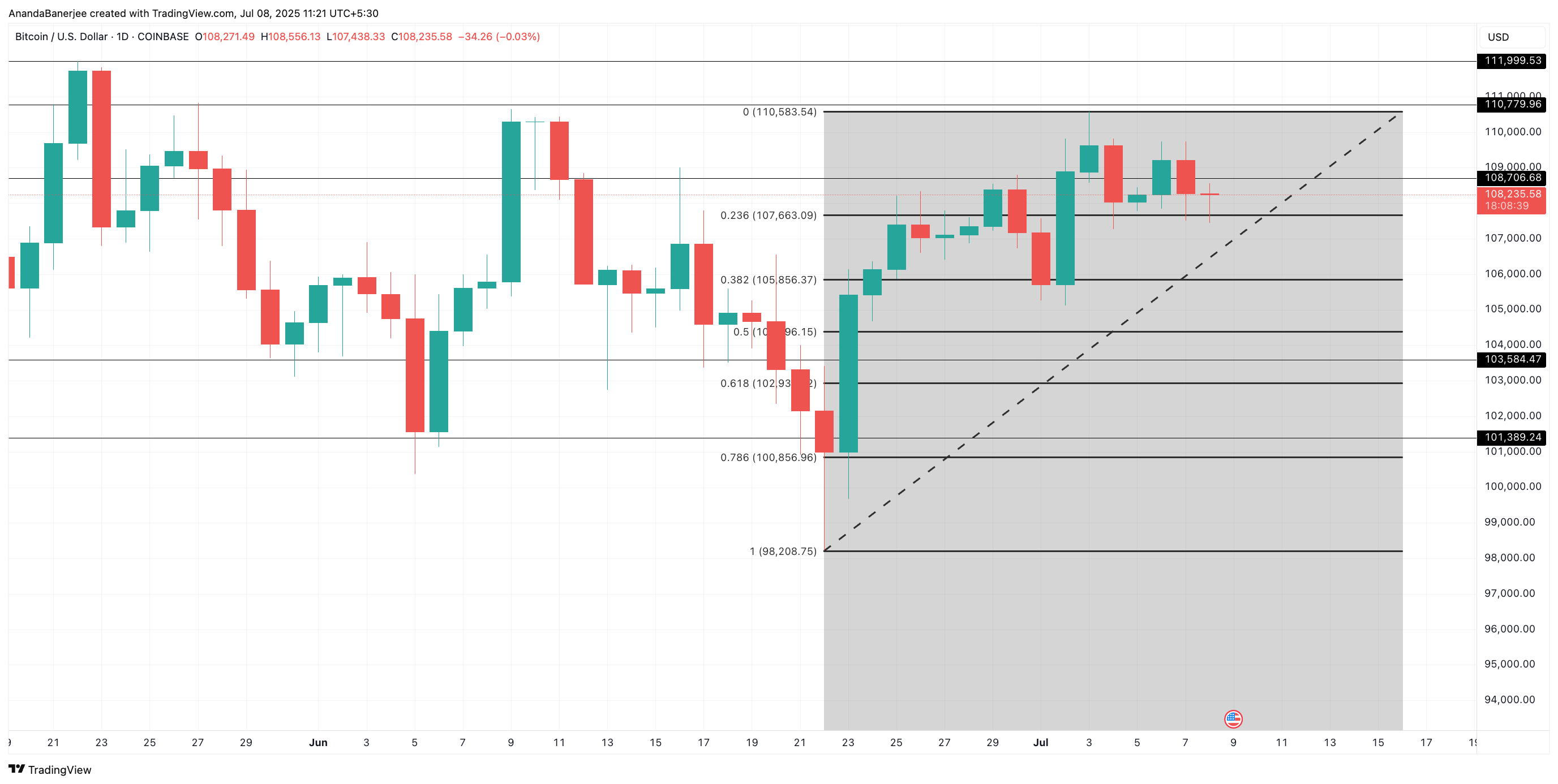 SponsoredНаразі торгуючись на рівні 108 235 доларів, біткоїн знаходиться трохи вище рівня корекції Фібоначчі 0,236, проведеного від недавнього мінімуму до максимуму. Цей рівень діє як магніт для консолідації ціни і зараз формує м’яку короткострокову базу.