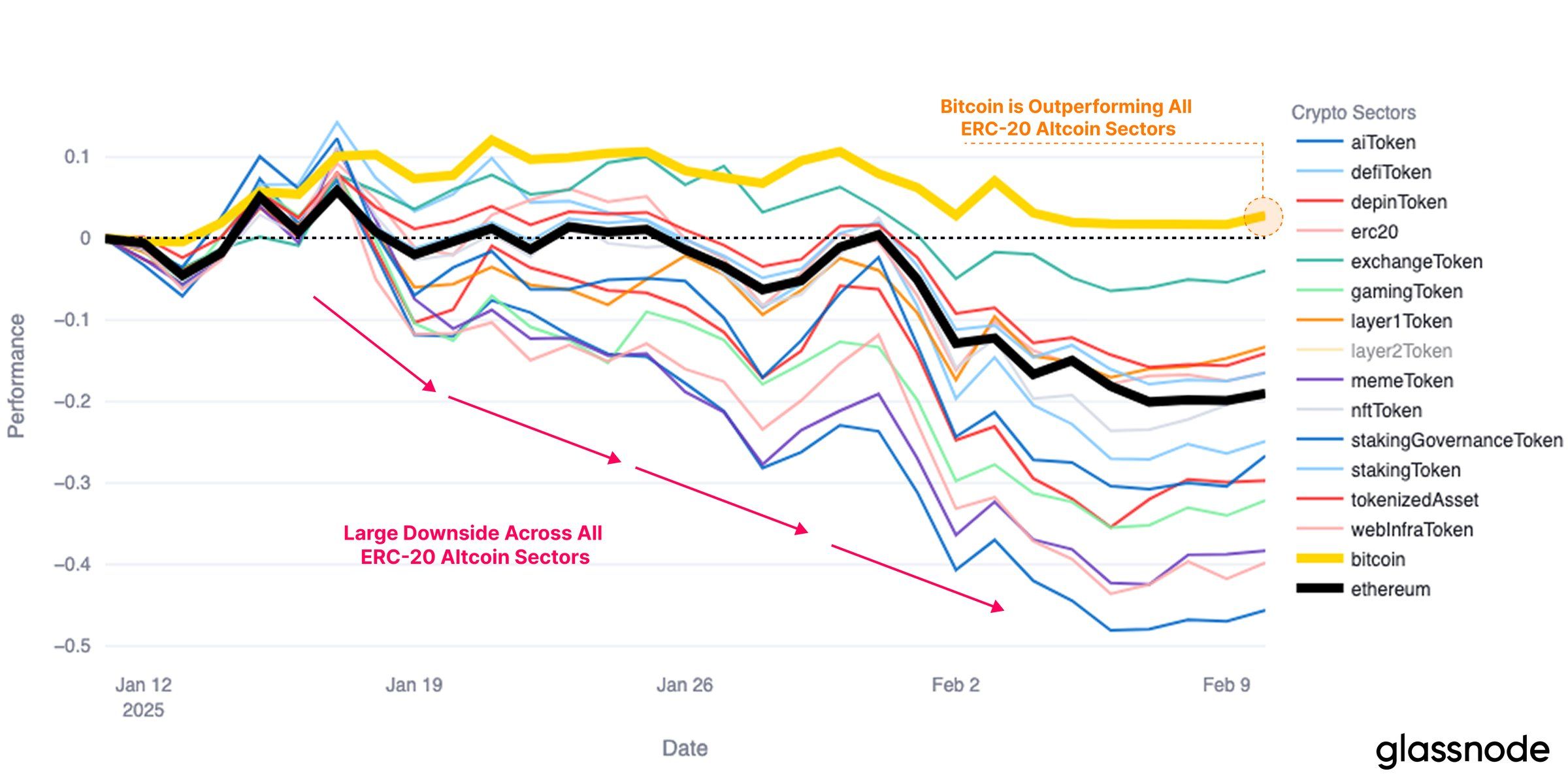 Упродовж останніх тижнів біткоїн вдалося залишатися поблизу своєї стартової позиції, незважаючи на загальну волатильність ринку. У той час як альткоїни, особливо ті, що в підсекторі ERC20, зазнали значного тиску продажів, біткоїн виявив стійкість. Ця відносна стабільність є позитивним індикатором, що демонструє силу біткоїна на тлі загальної слабкості ринку.