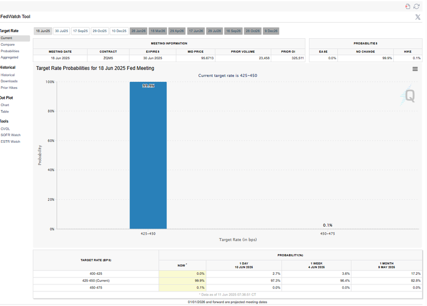 Згідно з CME FedWatchTool, існує 99,9 % ймовірність, що ФРС залишить процентні ставки на рівні 4,25-4,50 % на наступному засіданні. Наразі це означає майже 0 % ймовірність зниження процентних ставок ФРС.