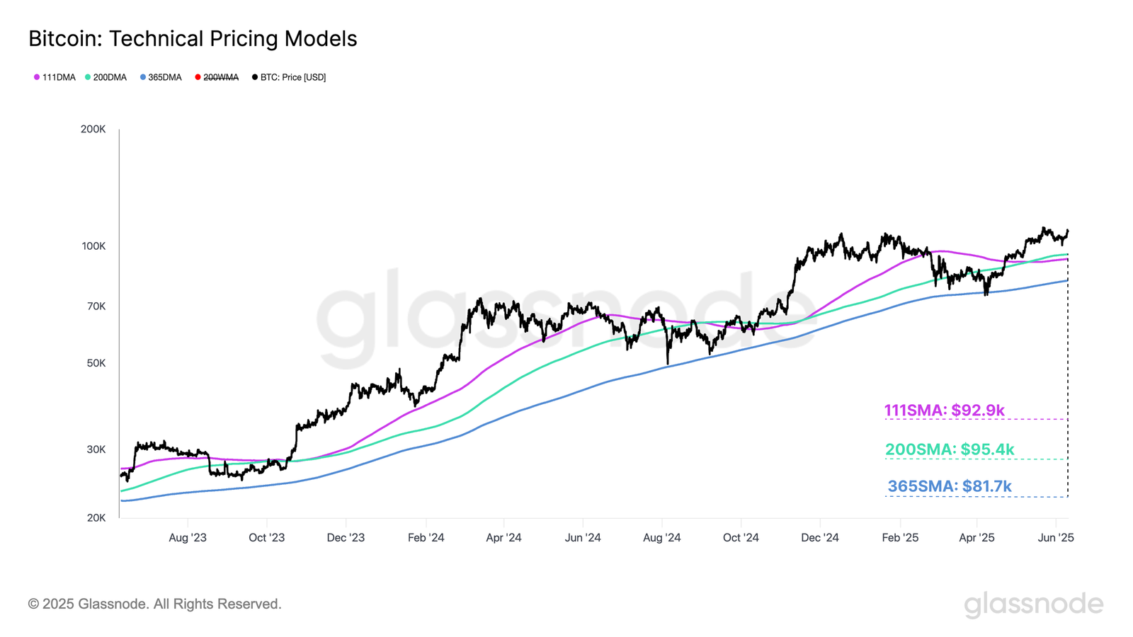 Макроекономічний імпульс біткоїна залишається сильним, підтримуваний ключовими ціновими моделями, такими як 111-денна змінна середня (DMA), 200 DMA та 365 DMA. Ці рівні історично виступали як сильні індикатори ринкового імпульсу. Наразі біткоїн торгується значно вище цих рівнів, що свідчить про те, що криптовалюта набрала значну ринкову силу.