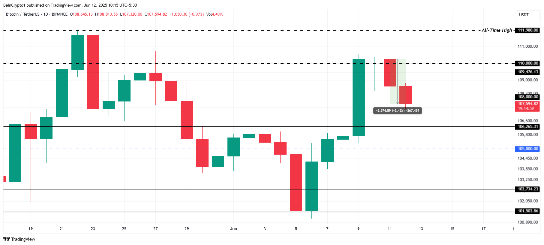 Біткоїн зазнав значного тиску останнім часом, коли ціна впала нижче 108 000 доларів після спроб утримати 110 000 доларів як рівень підтримки.
