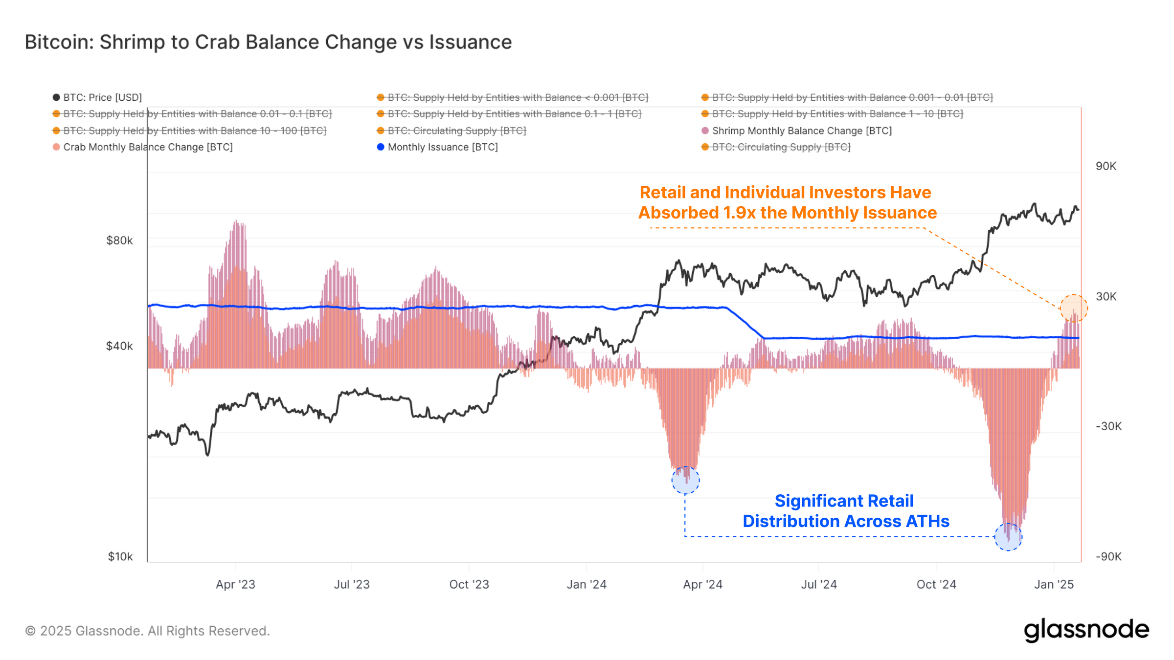 Сплеск балансу Креветки-Краби вказує на широку базу підтримки для ціни біткоїна. Зростаюча участь цієї демографічної групи відображає довгостроковий оптимізм. Їхня активність купівлі часто стабілізує ринок, діючи як подушка під час корекцій і підсилюючи цінові ралі під час бичачих фаз.