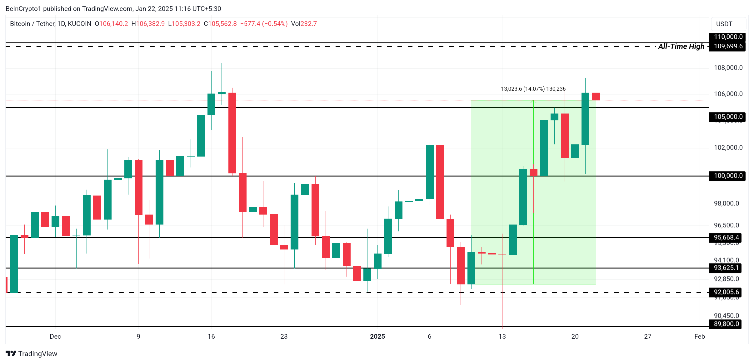Щоб забезпечити своє зростання, біткоїн повинен встановити 105 000 доларівів як сильний рівень підтримки. Наразі торгуючись близько 105 562 доларівів, король криптовалют здається добре підготовленим для досягнення цього. Успішний захист цієї зони підтримки може підштовхнути біткоїн до нових максимумів, відкриваючи подальший потенціал зростання.