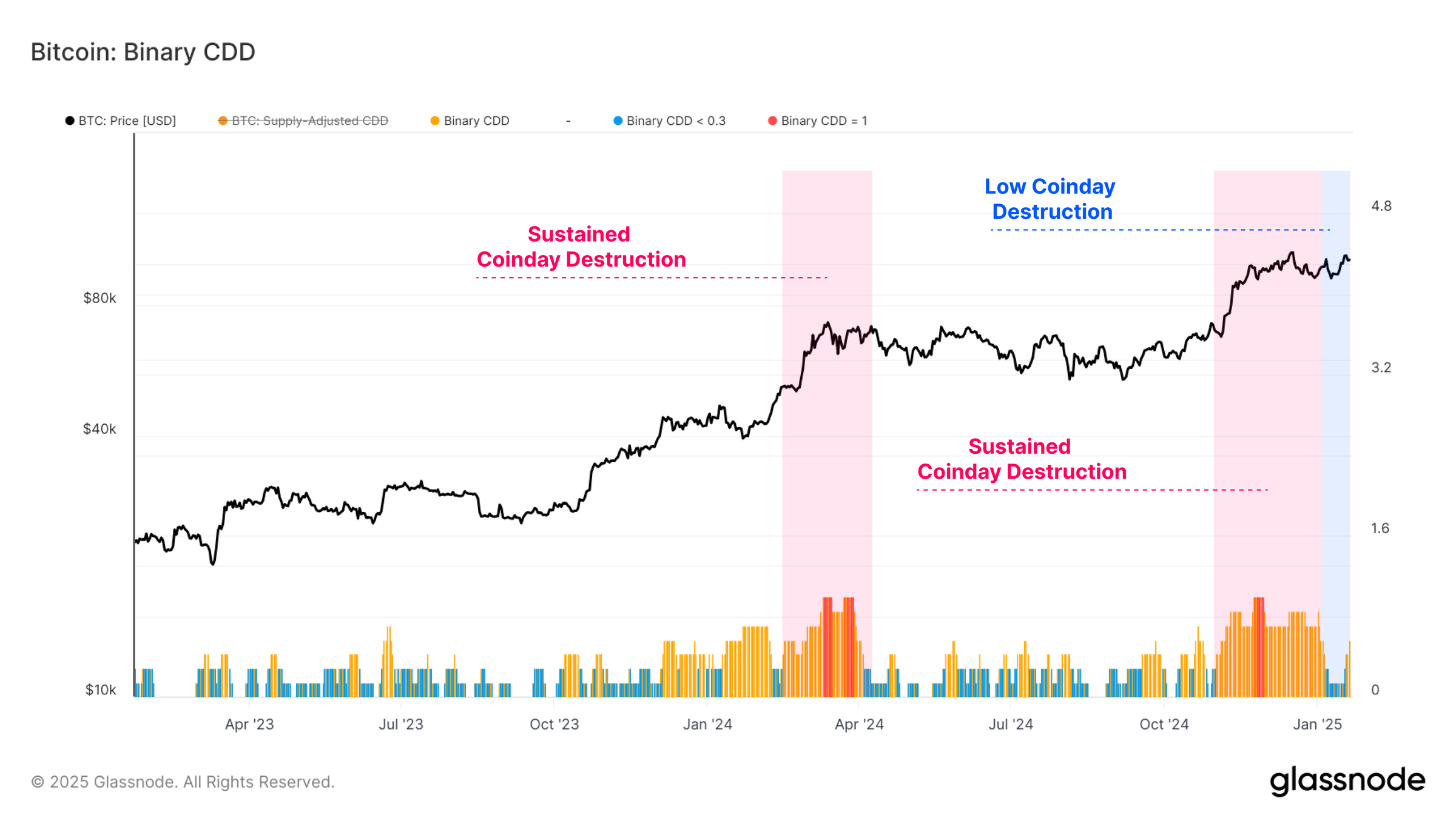 Ринкові настрої показали значну зміну в останні тижні, особливо через призму Coin Days Destroyed (CDD). Наприкінці 2024 року спостерігався період підвищеного CDD, що сигналізувало про активність серед довгострокових власників біткоїна (LTHs), які продавали під час зростання.