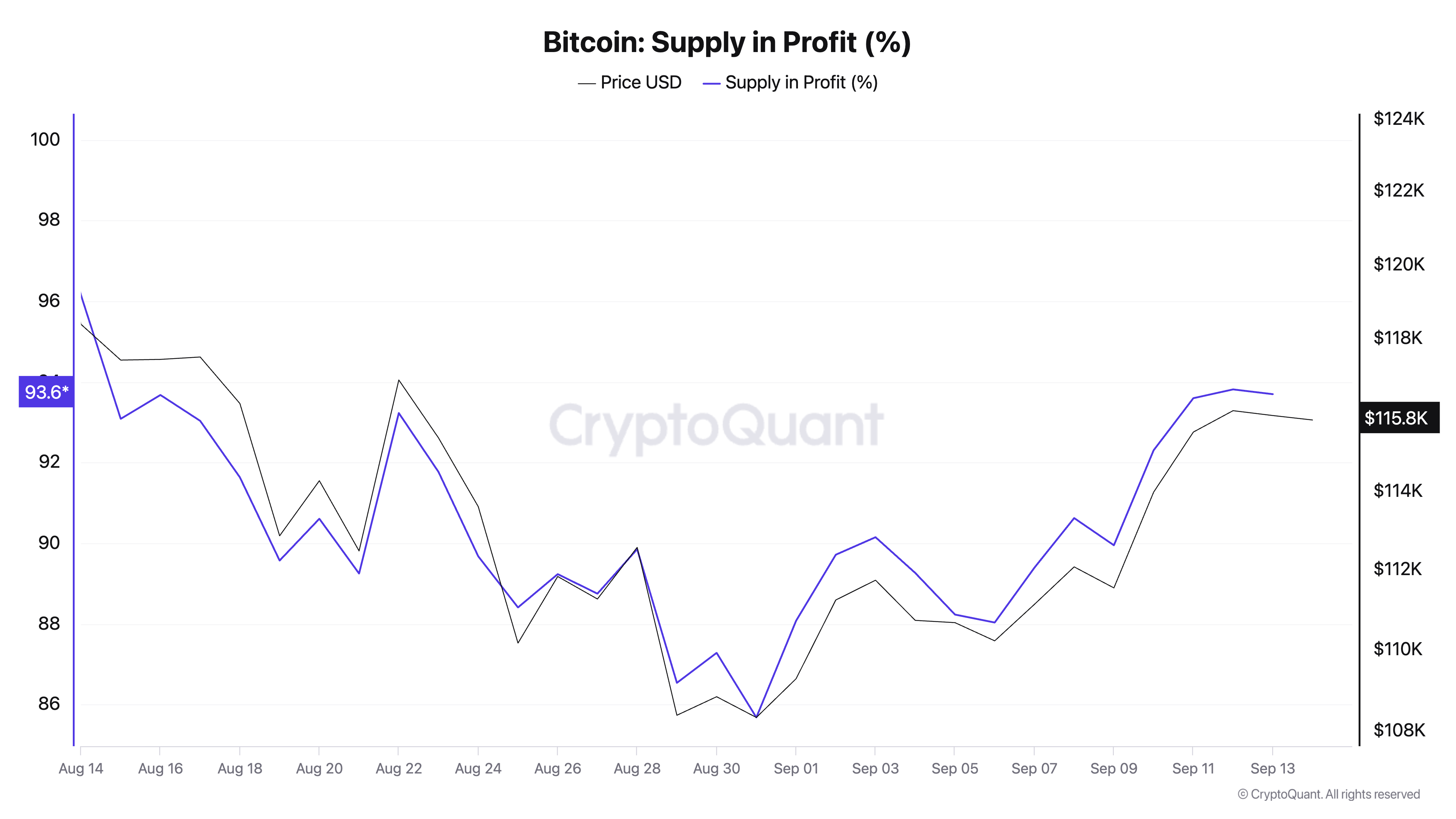 SponsoredДані CryptoQuant показують, що 93,6% циркулюючої пропозиції Bitcoin в даний час припадає на прибуток, і ця тенденція історично супроводжувалася сильними бичачими фазами.