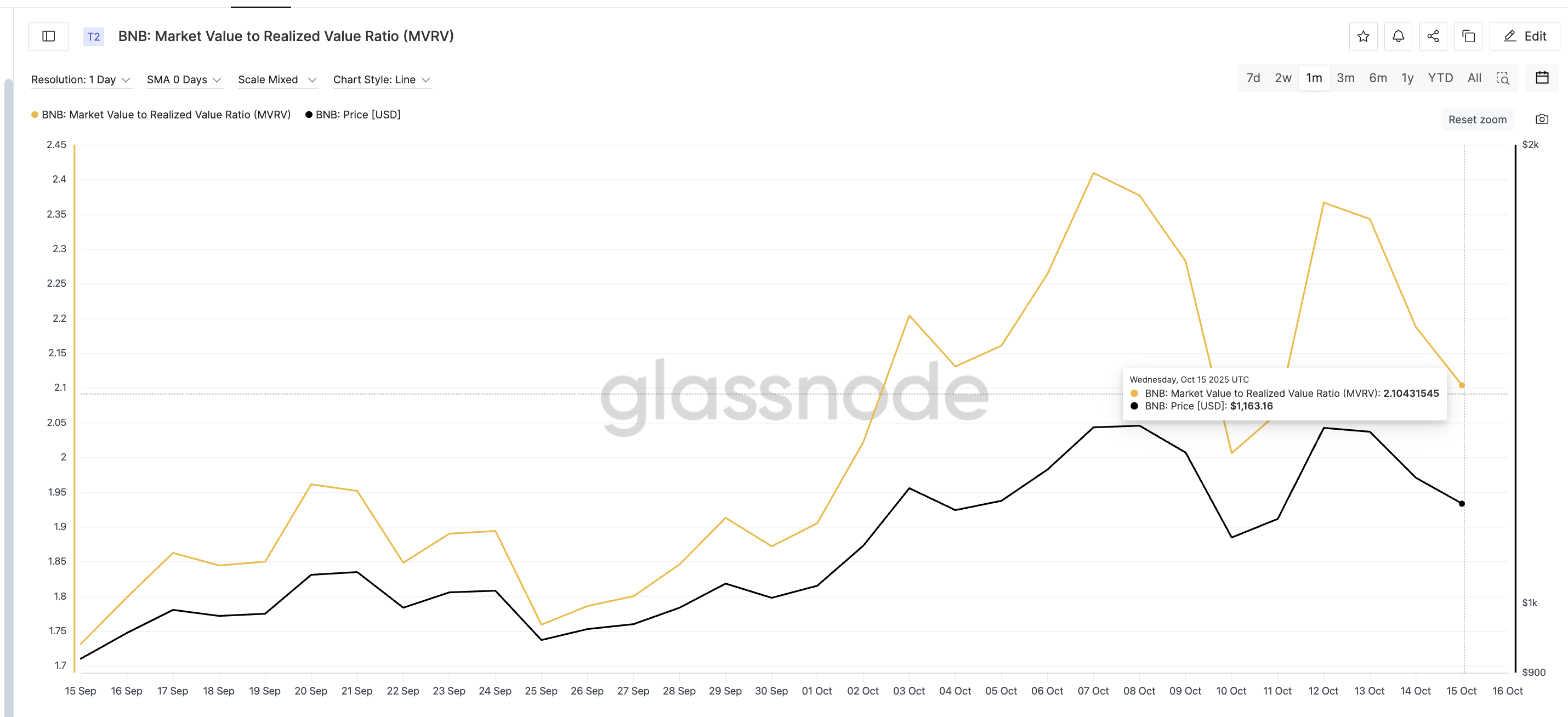 7 жовтня, коли ціна BNB досягла $1 300, коефіцієнт MVRV досяг піку на рівні 2,40, що вказує на розтягнутий рівень прибутку. Через кілька днів, під час різкого падіння з $1 300 до $1 100 (падіння на 15,7%), коефіцієнт досяг дна в районі 2,00. Це була зона, схожа на місцевий мінімум від 4 жовтня, і передувала відскоку на 15% з $1 100 до майже $1 300 всього за два дні.