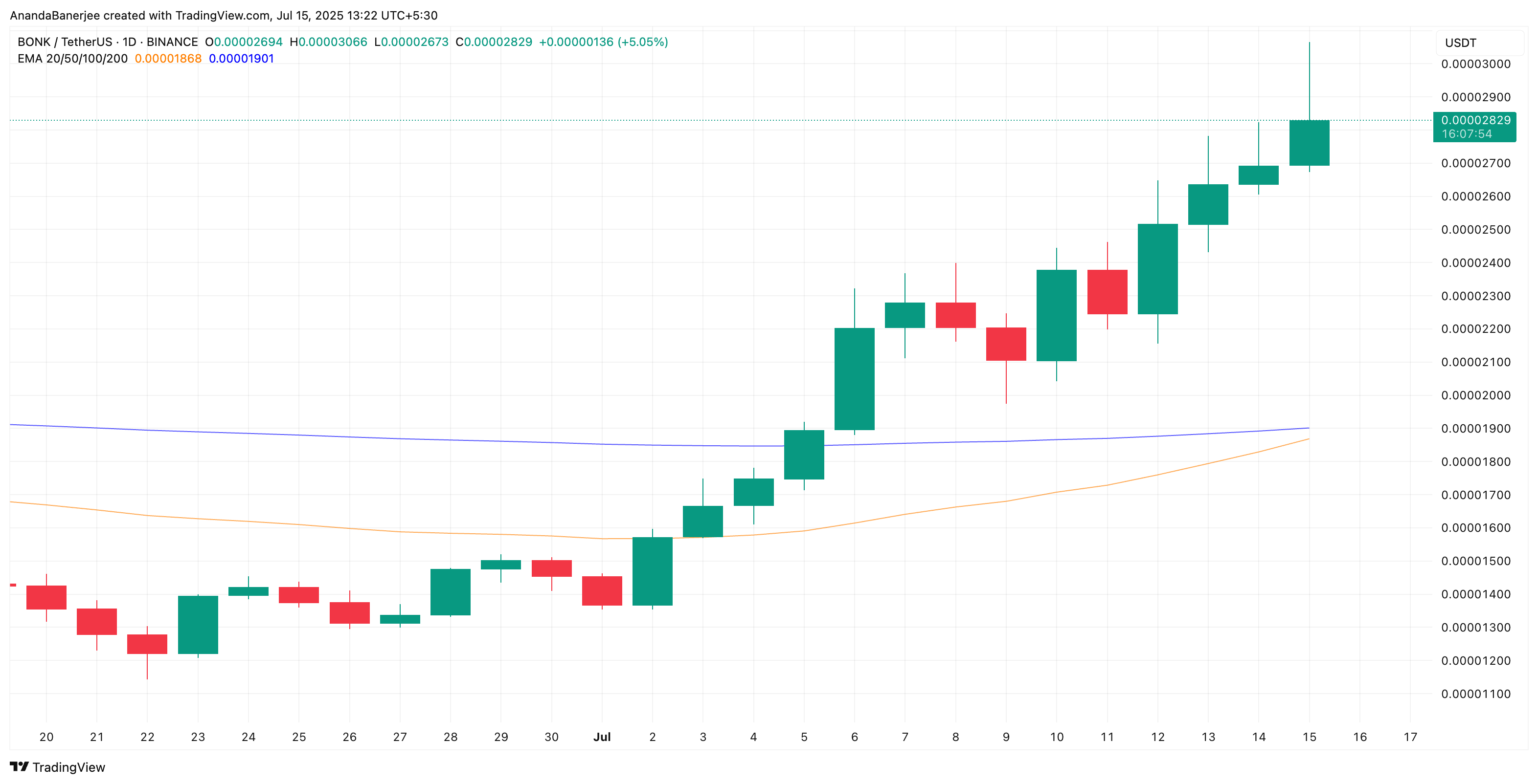 BONK на межі підтвердження золотого перетину, коли 50-денна експоненційна змінна середня (EMA) перетинає 200-денну EMA. Цей імпульсний сигнал широко відстежується в технічному аналізі і зазвичай свідчить про початок довгострокового висхідного тренду.