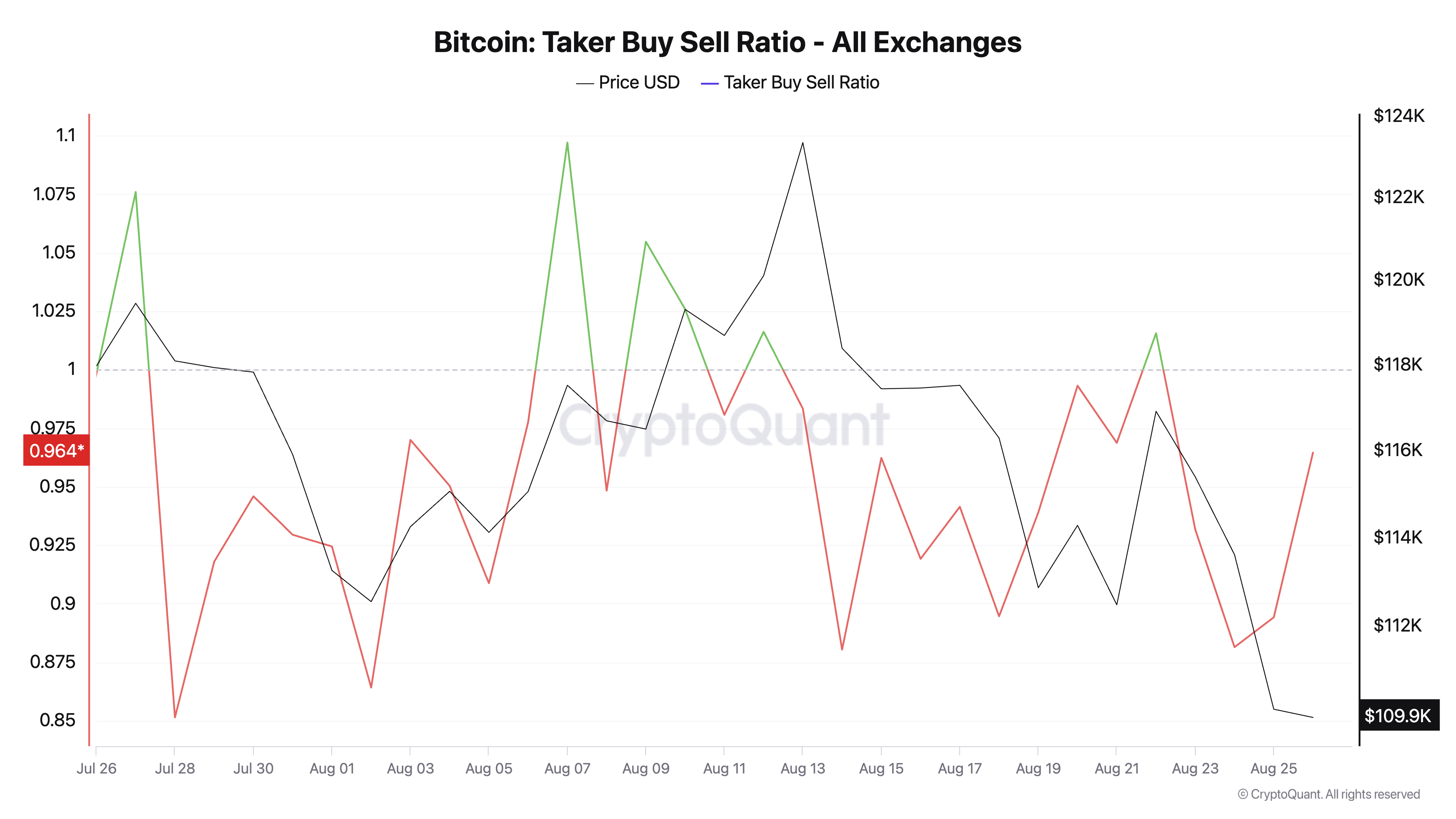 Однією з найбільш показових ознак є співвідношення “тейкер-купівля” BTC, яке з липня було переважно негативним. На момент виходу статті він становить 0,96 за CryptoQuant, що вказує на те, що ордери на продаж домінують над ордерами на покупку на ф’ючерсному ринку монети.