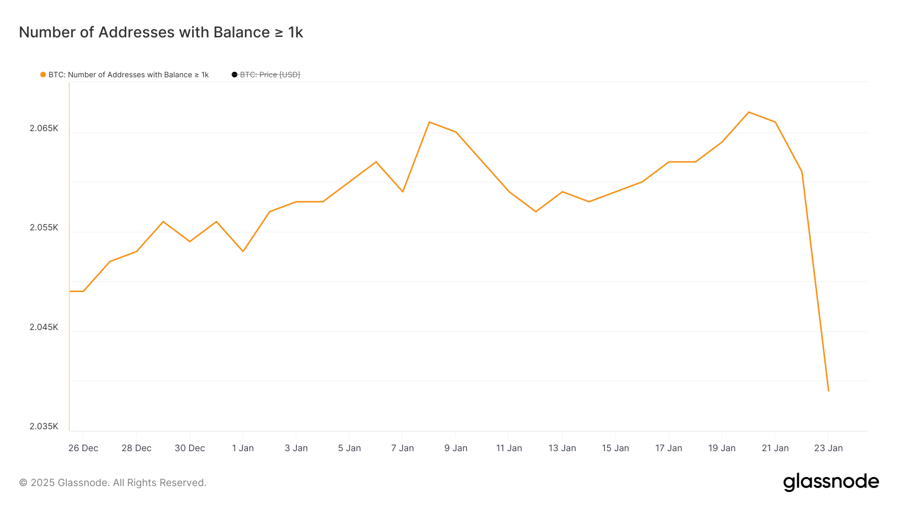 Кількість китів біткоїна – гаманців, що містять щонайменше 1 000 BTC – різко знизилася з 2 067 20 січня до 2 039 23 січня, досягнувши найнижчого рівня з 30 січня 2024 року.