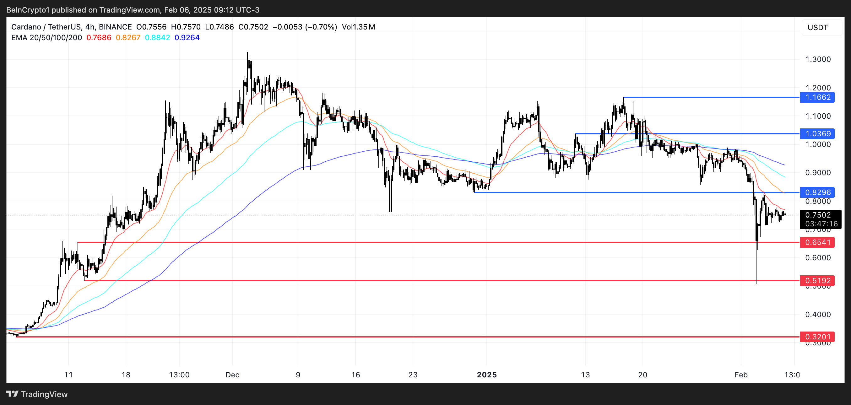 Ціна Cardano наразі коливається між підтримкою на $0,65 і опором на $0,82, при цьому лінії EMA показують ведмежу установку — короткострокові EMA розташовані нижче довгострокових.