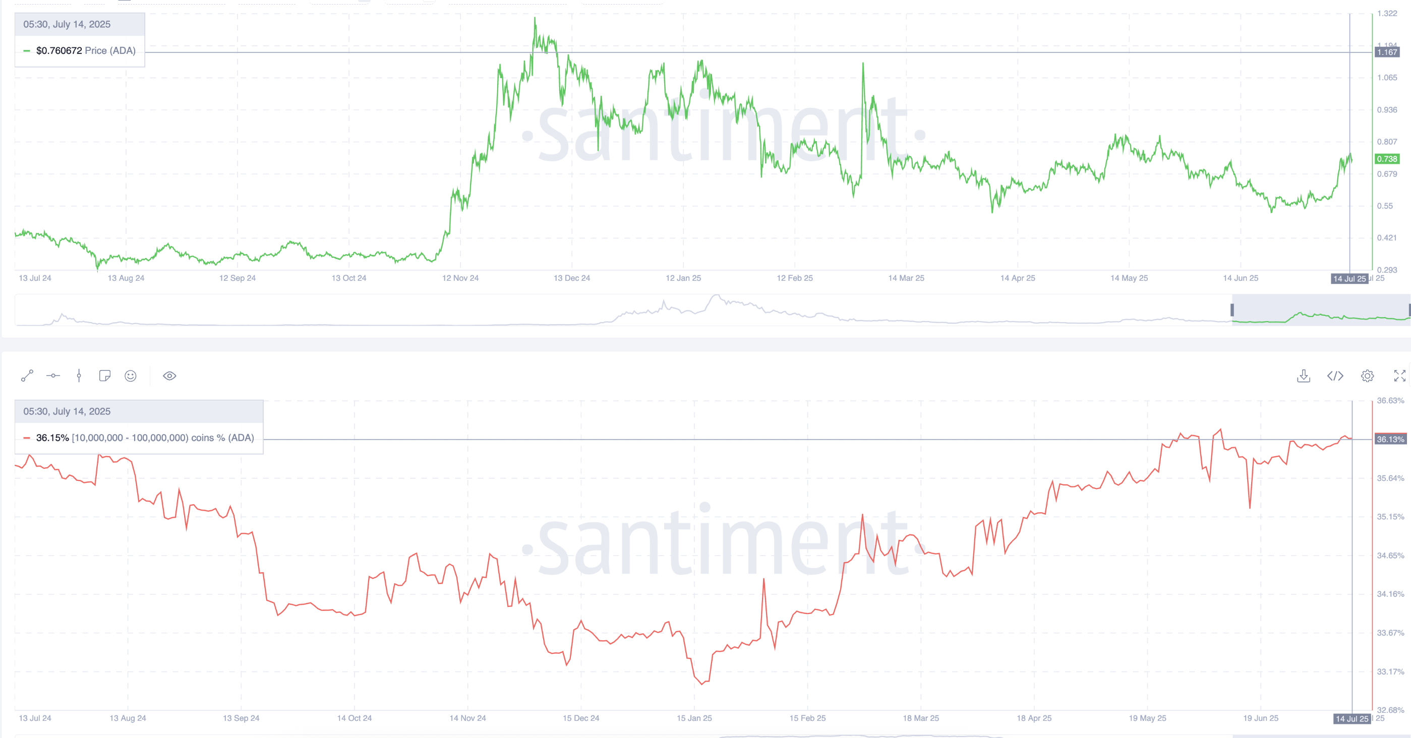 Група гаманців з 1 мільйоном – 10 мільйонами ADA, часто класифікована як кити, стабільно збільшила свої запаси з ~33 % у січні до 36,15 % у середині липня. Незважаючи на різке зростання ADA у березні, ця когорта не зменшила свою зацікавленість. Це сигналізує, що провідні власники очікують подальшого зростання.