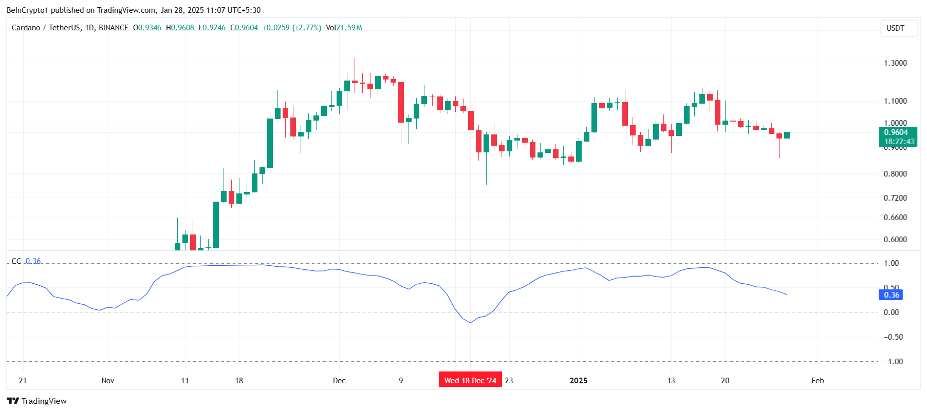 SponsoredІсторично така дивергенція передувала корекціям для ADA, оскільки альткоїн втрачає підтримку широкого впливу біткоїна. Це послаблення зв’язків викликає сумніви щодо здатності ADA самостійно відновлюватися.