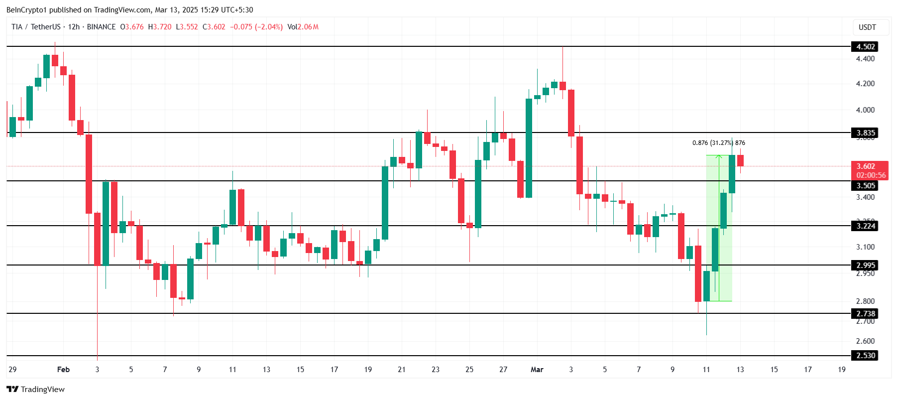 Celestia (TIA) нещодавно продемонстрував відновлення, досягнувши 3,60 доларів після зростання на 31% за останні 48 годин. Ця цінова динаміка допомогла альткоїну відновити більшість своїх недавніх втрат.