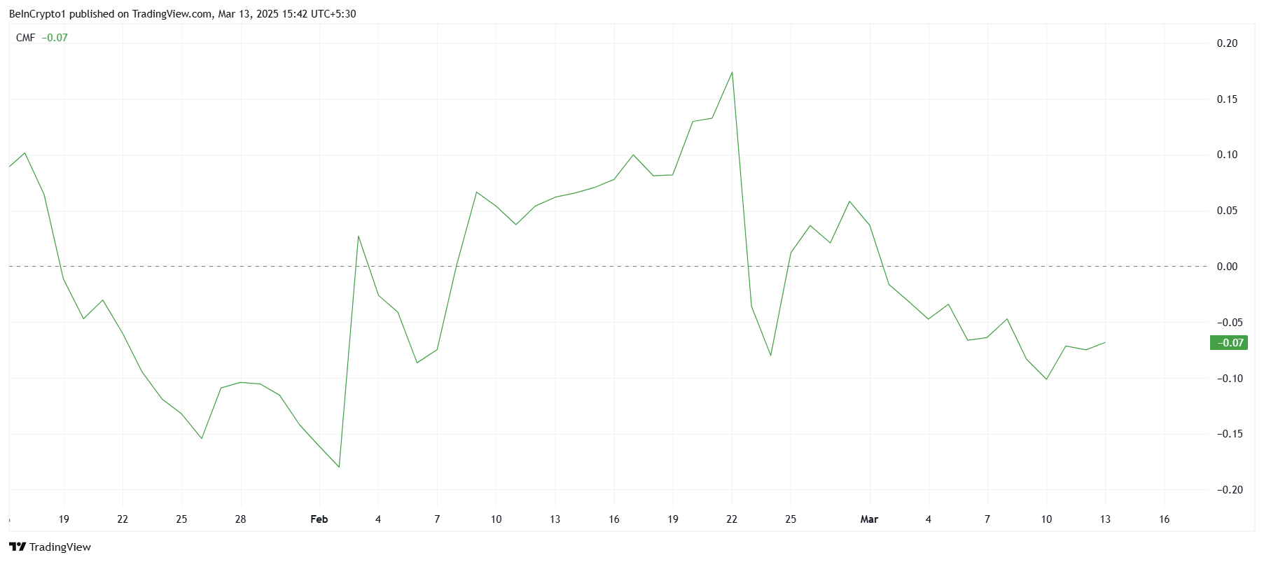 Позиція CMF нижче нульової лінії зазвичай свідчить про слабкі припливи капіталу, що може ускладнити здатність TIA нарощувати недавні здобутки.