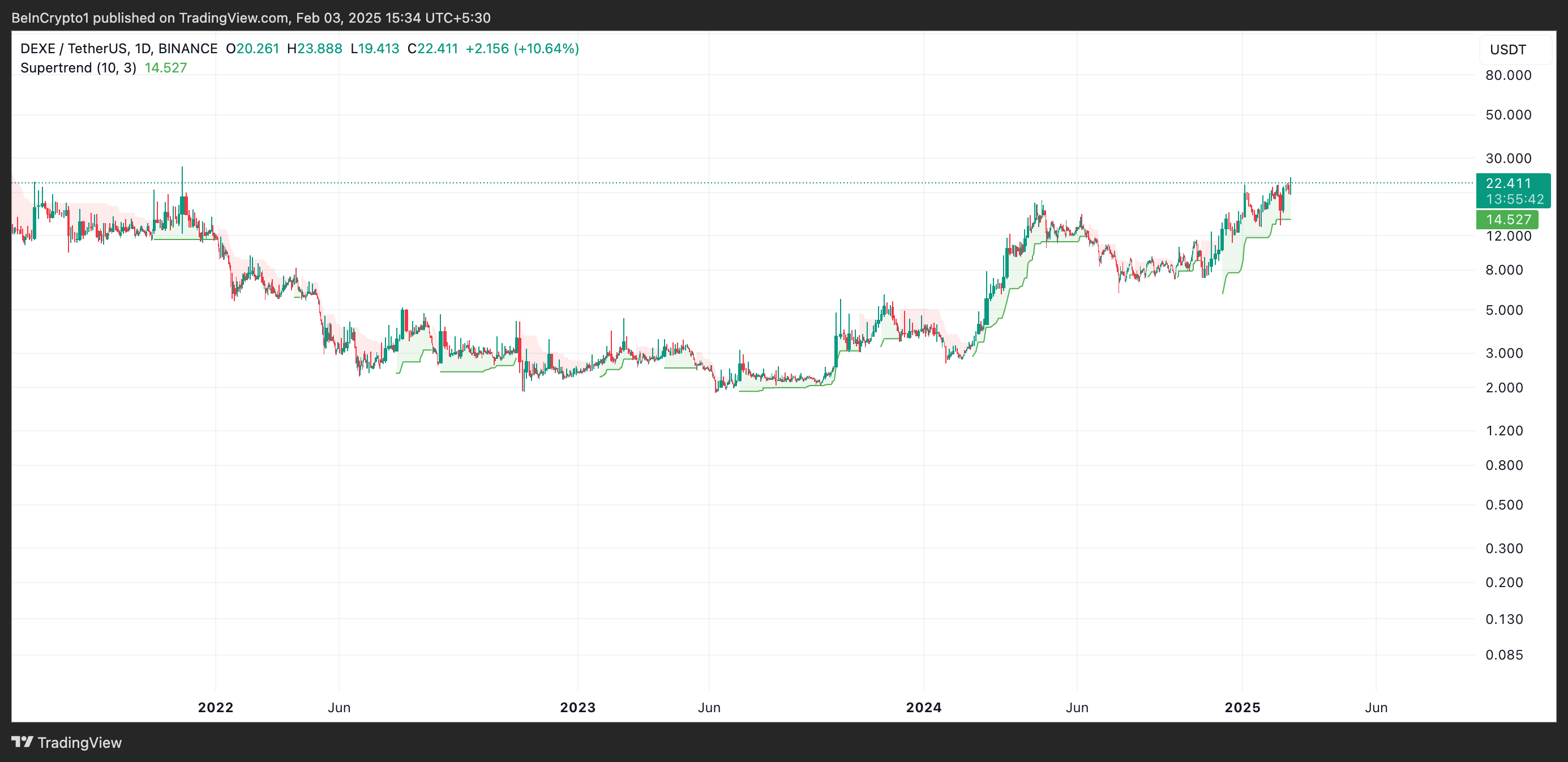 Налаштування його індикатора Super Trend підтримує цей оптимістичний прогноз. На момент публікації зелена лінія індикатора діє як динамічна підтримка для ціни DEXE на рівні 14,52 доларів.