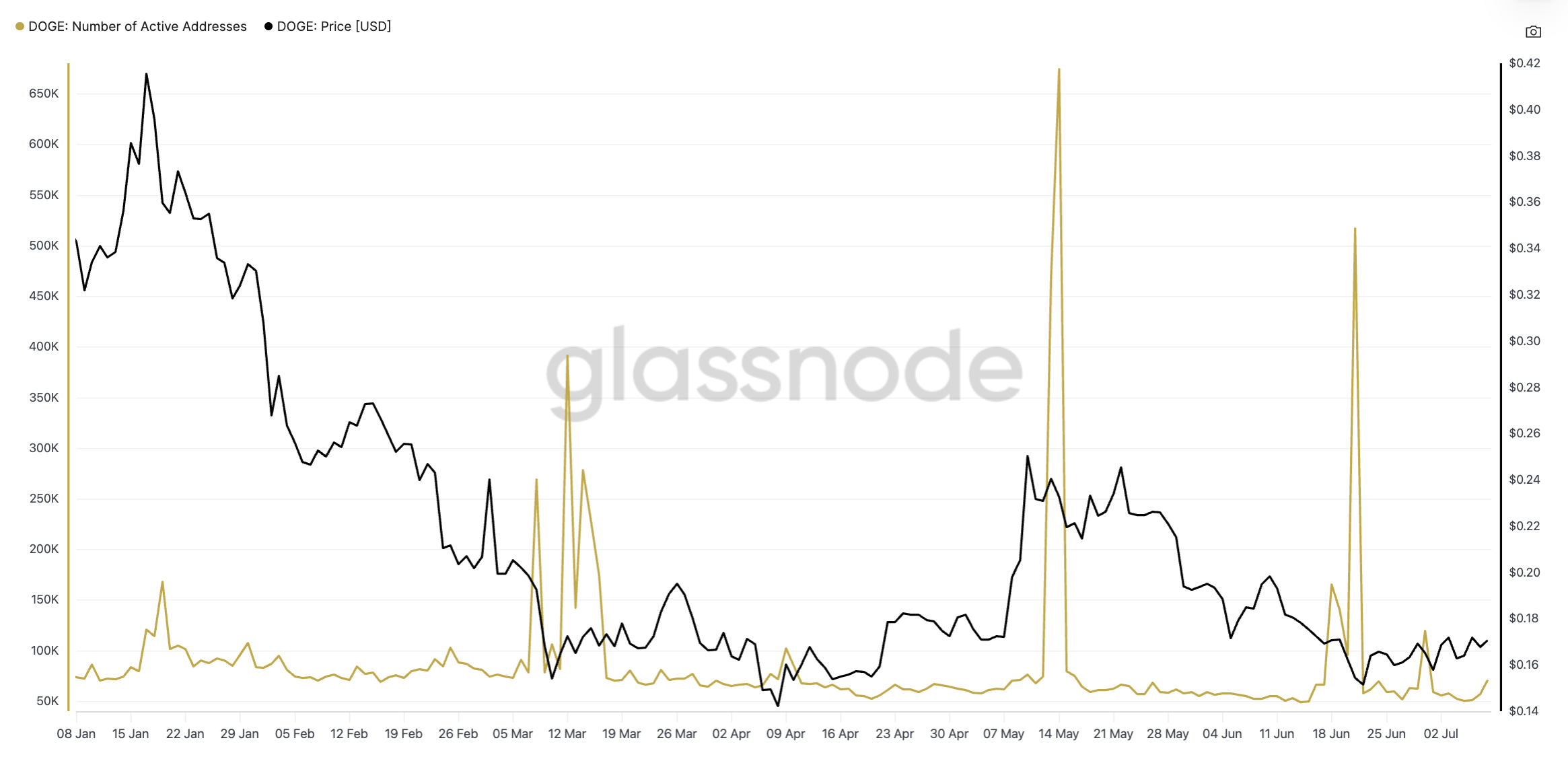 Навіть з підвищенням ціни наприкінці червня, кількість активних адрес Dogecoin не зросла. Кількість щоденних транзакційних гаманців, ключовий сигнал роздрібного та органічного попиту, залишалася здебільшого стабільною з незначними сплесками в різні періоди.